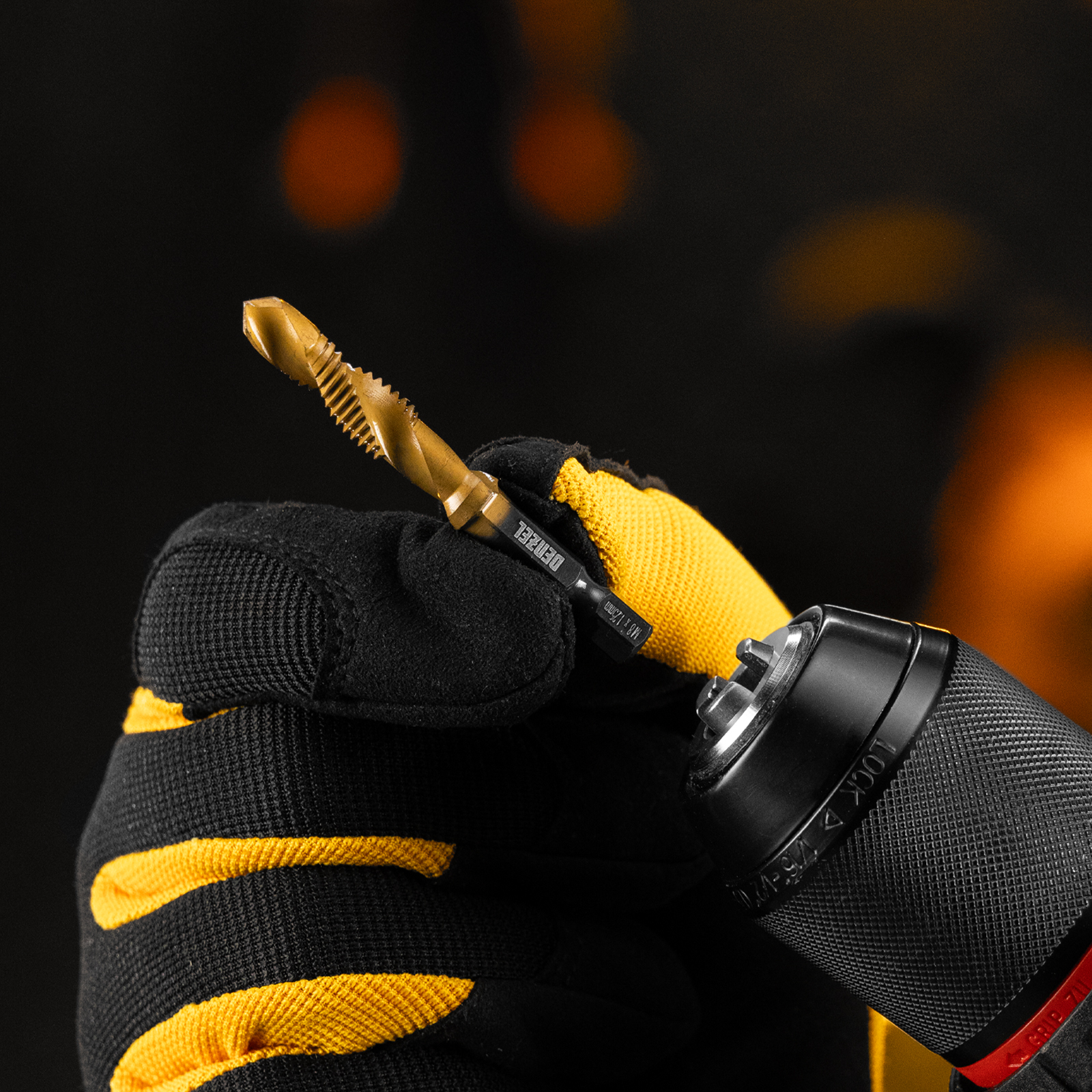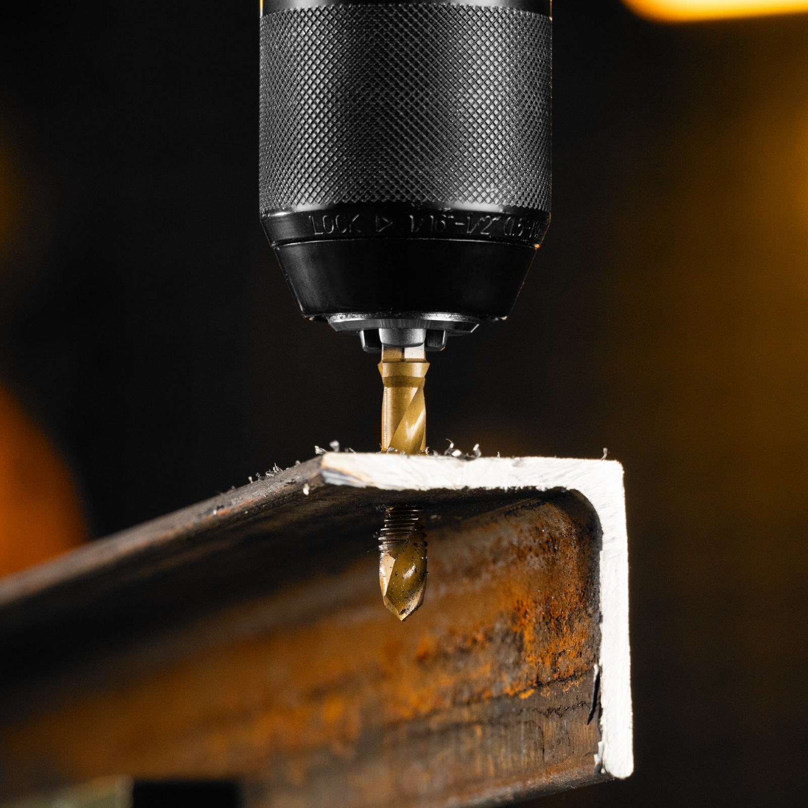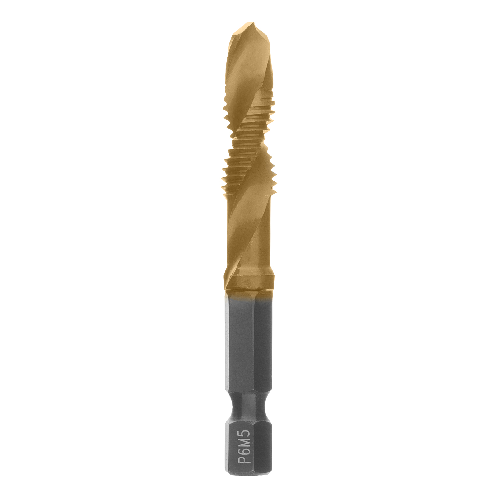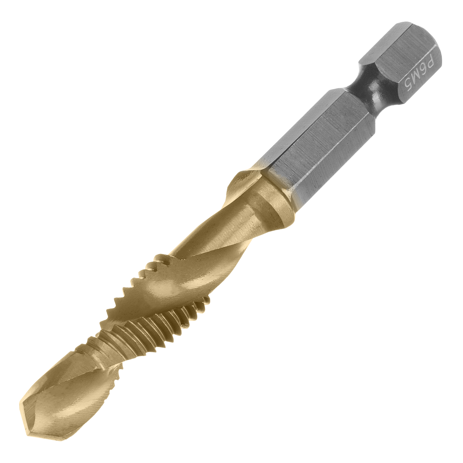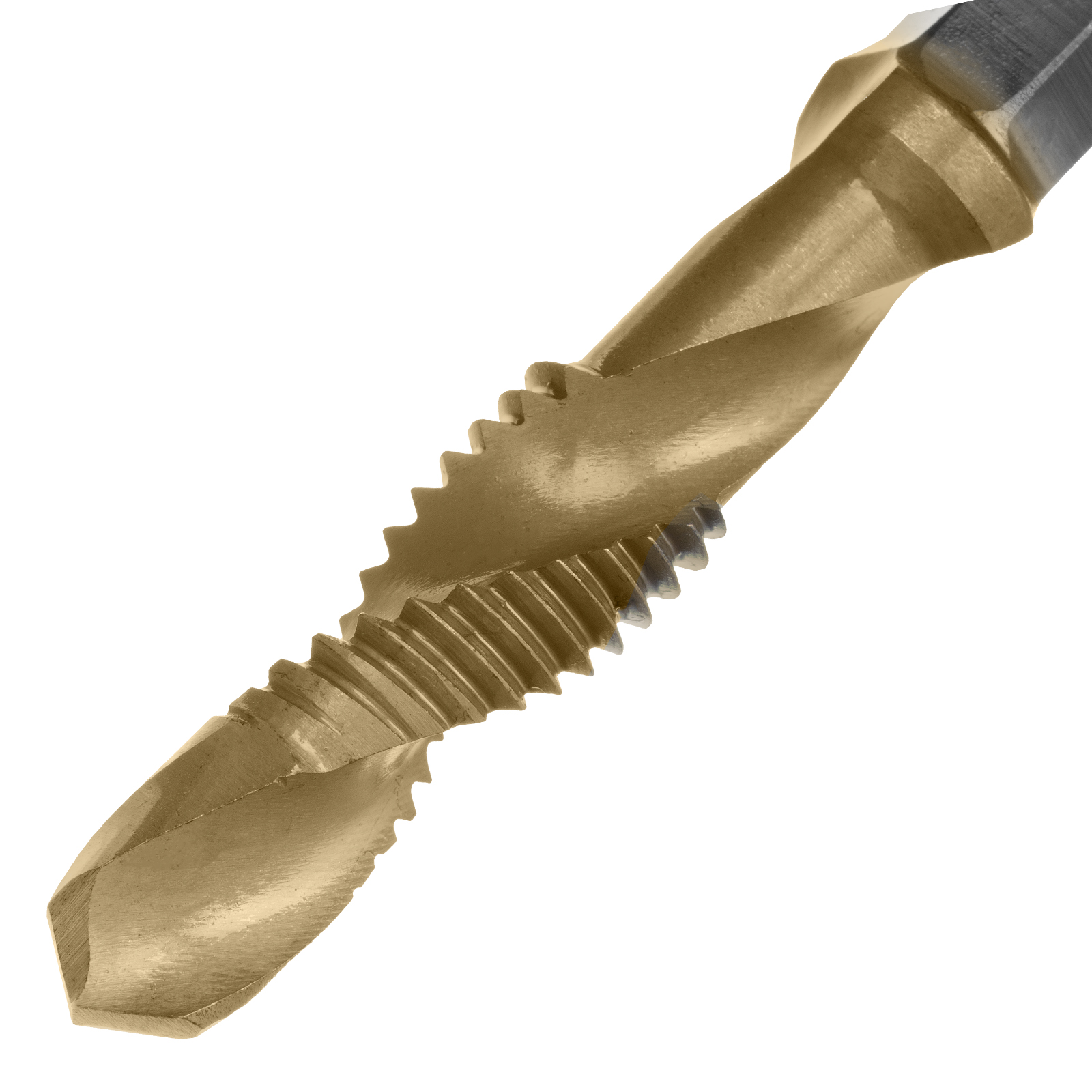 - Долговечность — нитридтитановое покрытие защищает от повреждений и уменьшает трение, что увеличивает устойчивость сверла-метчика к износу.