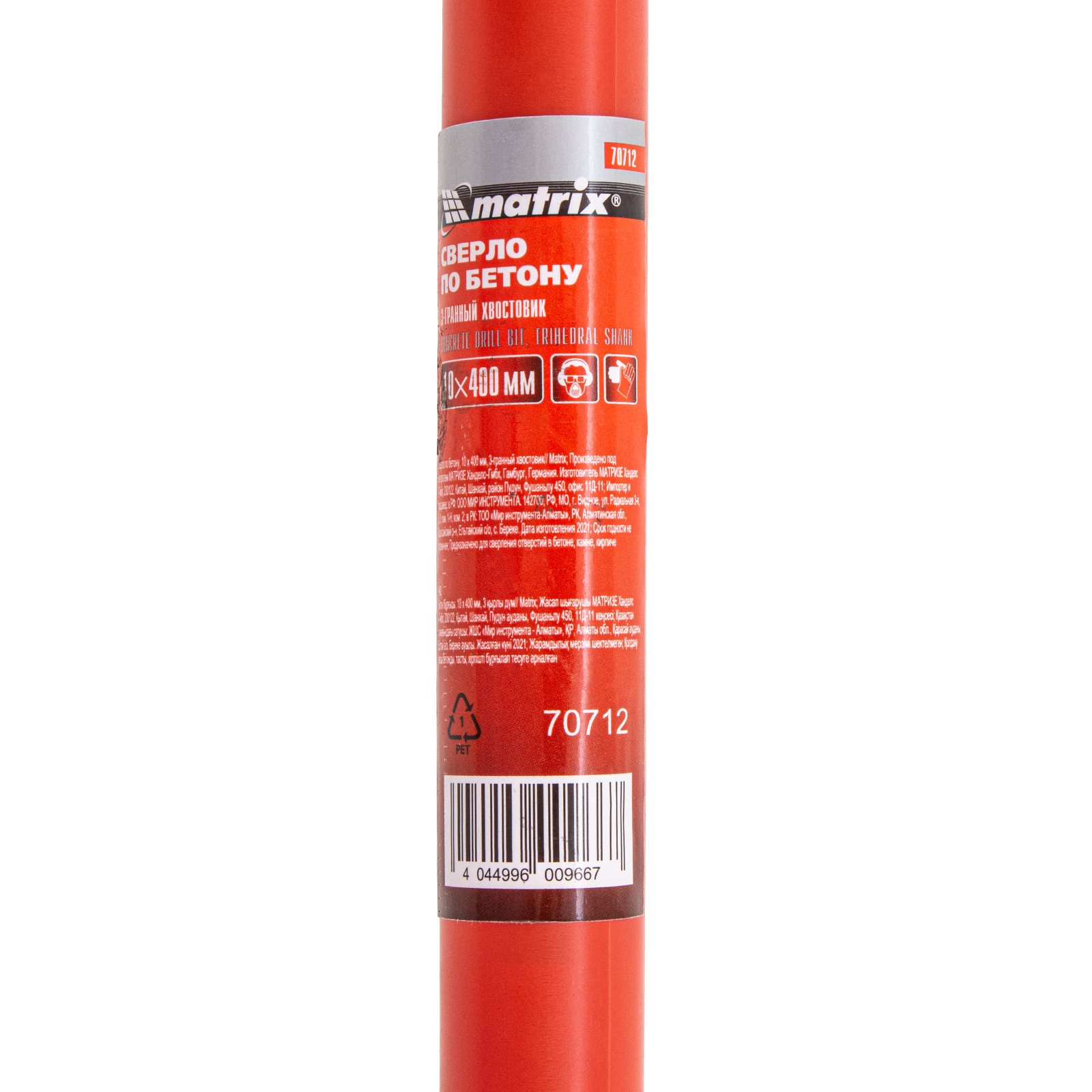 Сверло по бетону Matrix 70712 размером 10 х 400 мм, с 3-гранным хвостовиком, используется для получения отверстий с помощью дрели. Пригодится для сверления бетона, мрамора, керамики и других твердых материалов.