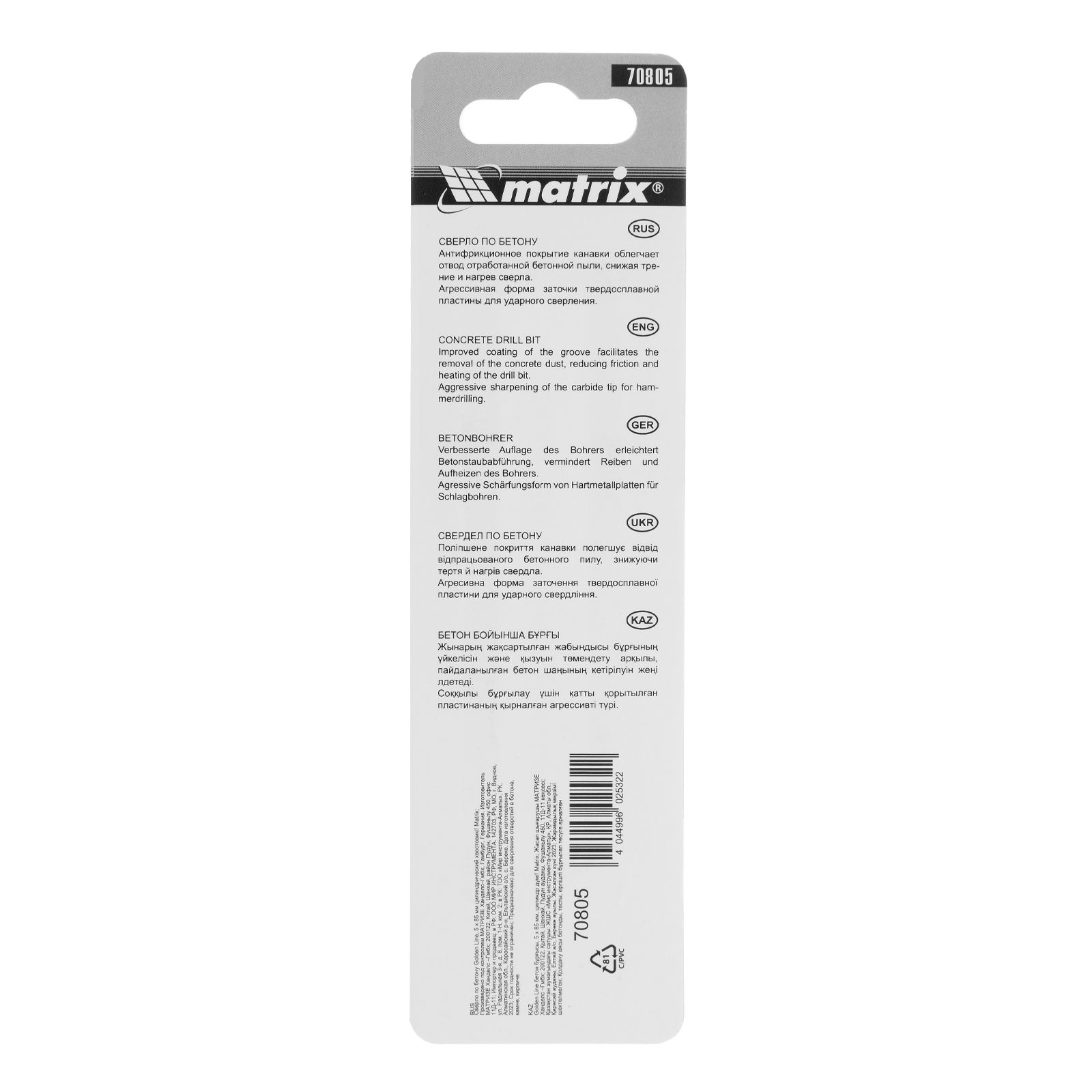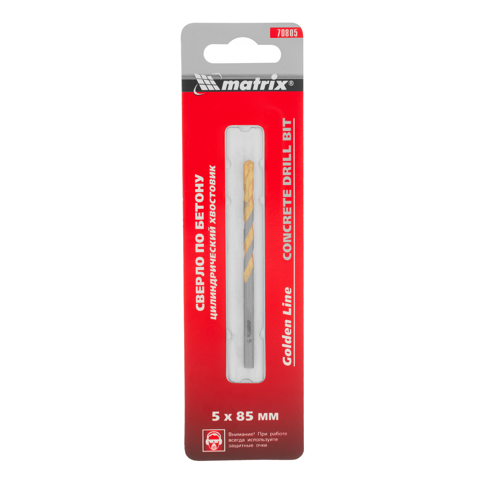 Сверло по бетону Matrix Golden Line 70805 размером 5 х 85 мм, с цилиндрическим хвостовиком, — сменная оснастка для дрели. Благодаря агрессивной форме заточки его можно использовать в режиме ударного сверления. Оснастка предназначена для работы с бетоном, кирпичом и другими твердыми материалами.