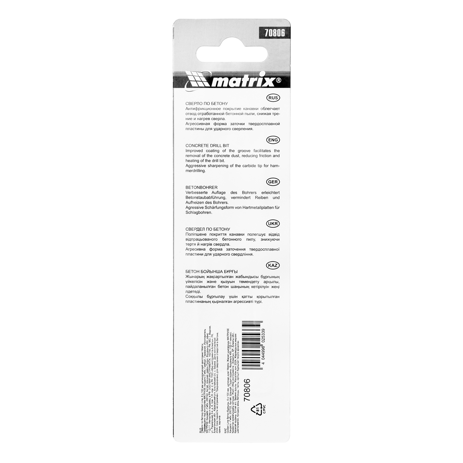 Сверло по бетону Matrix Golden Line 70806 размером 6 х 100 мм, с цилиндрическим хвостовиком, — сменная оснастка для дрели. Благодаря агрессивной форме заточки его можно использовать в режиме ударного сверления. Оснастка предназначена для работы с бетоном, кирпичом и другими твердыми материалами.