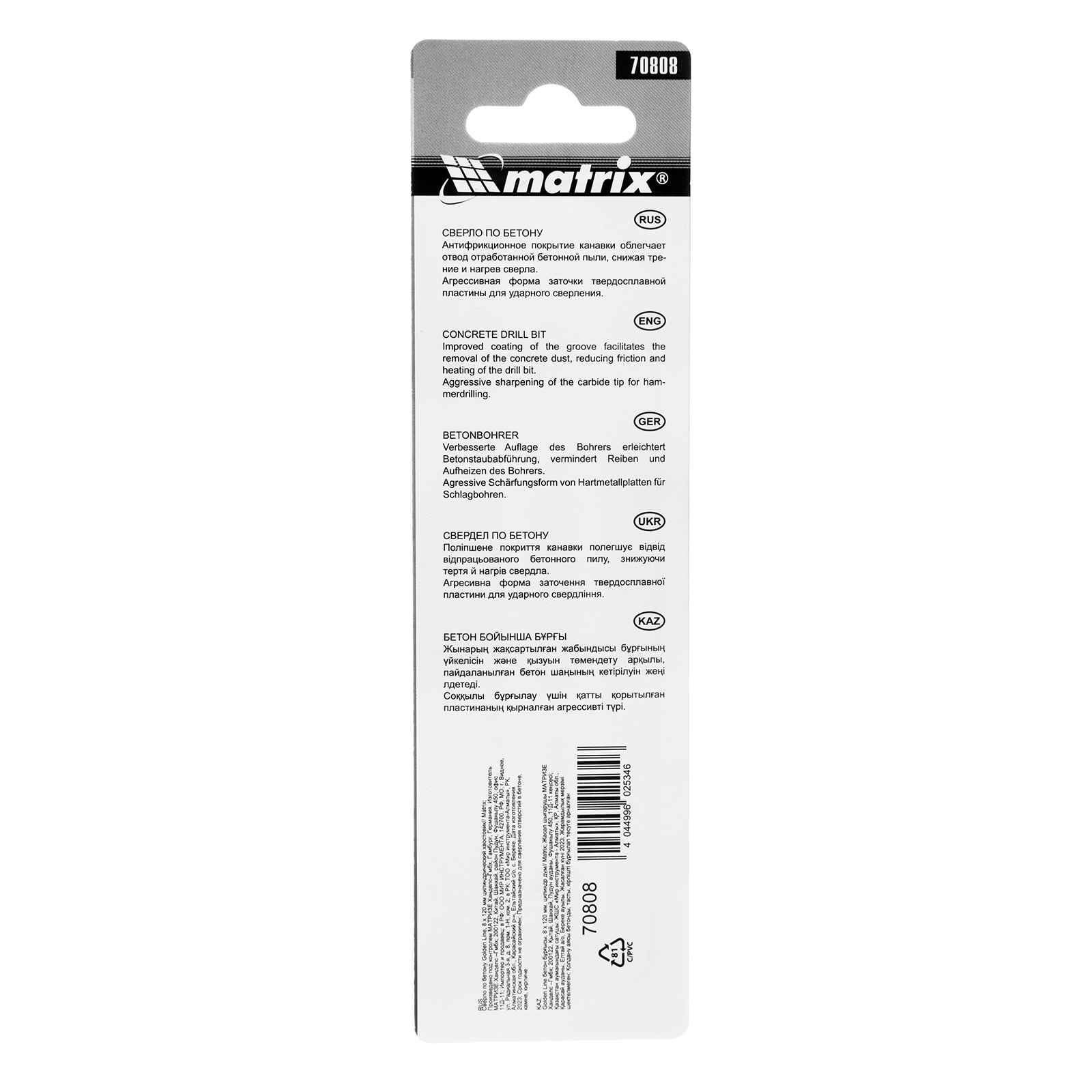 Сверло по бетону Matrix Golden Line 70808 размером 8 х 120 мм, с цилиндрическим хвостовиком, — сменная оснастка для дрели. Благодаря агрессивной форме заточки его можно использовать в режиме ударного сверления. Оснастка предназначена для работы с бетоном, кирпичом и другими твердыми материалами.
