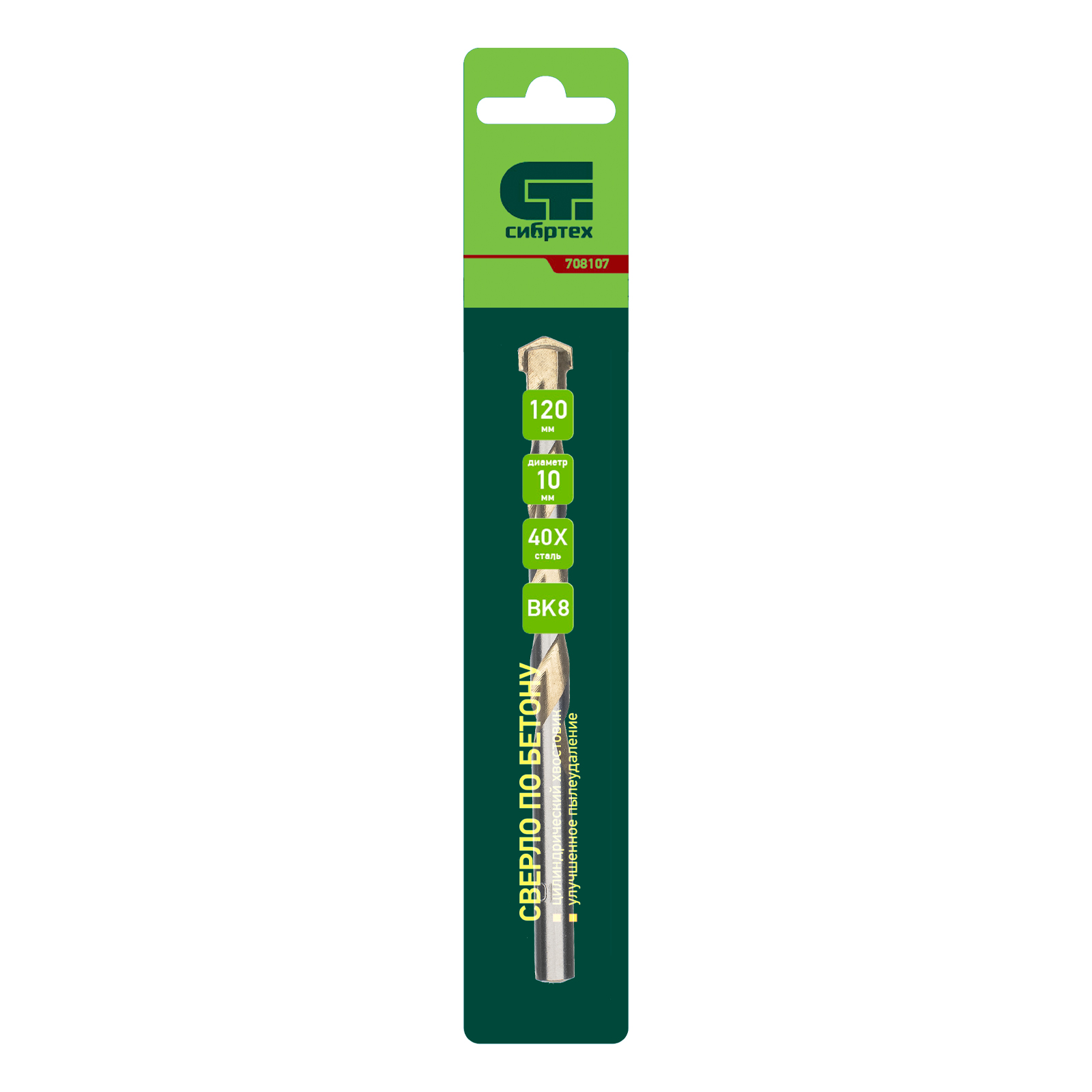 Сверло по бетону Сибртех 708107 диаметром 10 мм и длиной 120 мм, с цилиндрическим хвостовиком и улучшенным пылеудалением, предназначено для сверления в ударном режиме бетона и кирпича. Пригодится во время строительных и ремонтных работ.