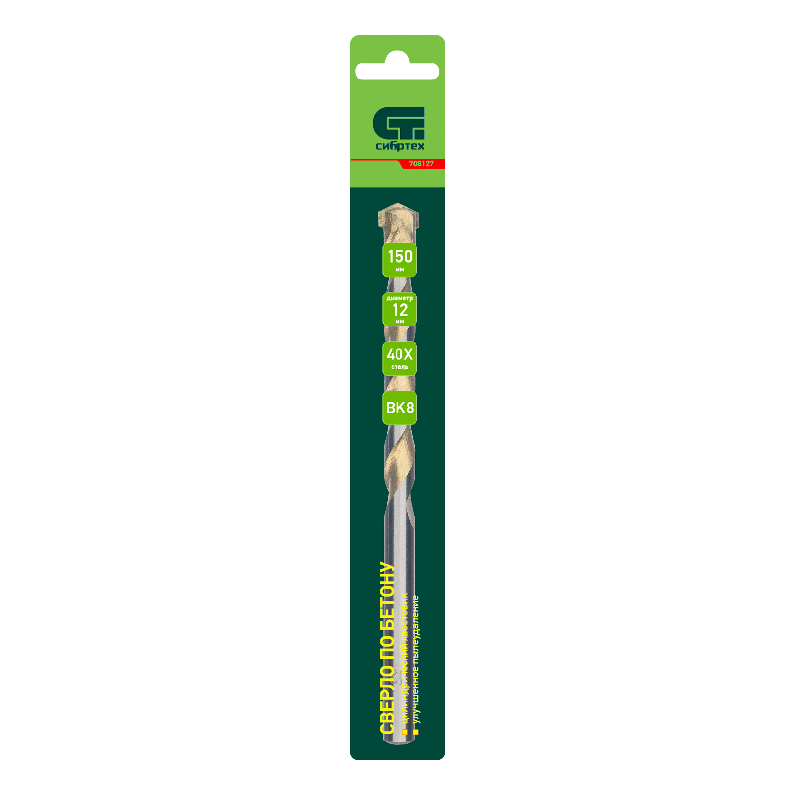 Сверло по бетону Сибртех 708127 диаметром 12 мм и длиной 150 мм, с цилиндрическим хвостовиком и улучшенным пылеудалением, предназначено для сверления в ударном режиме бетона и кирпича. Пригодится во время строительных и ремонтных работ.