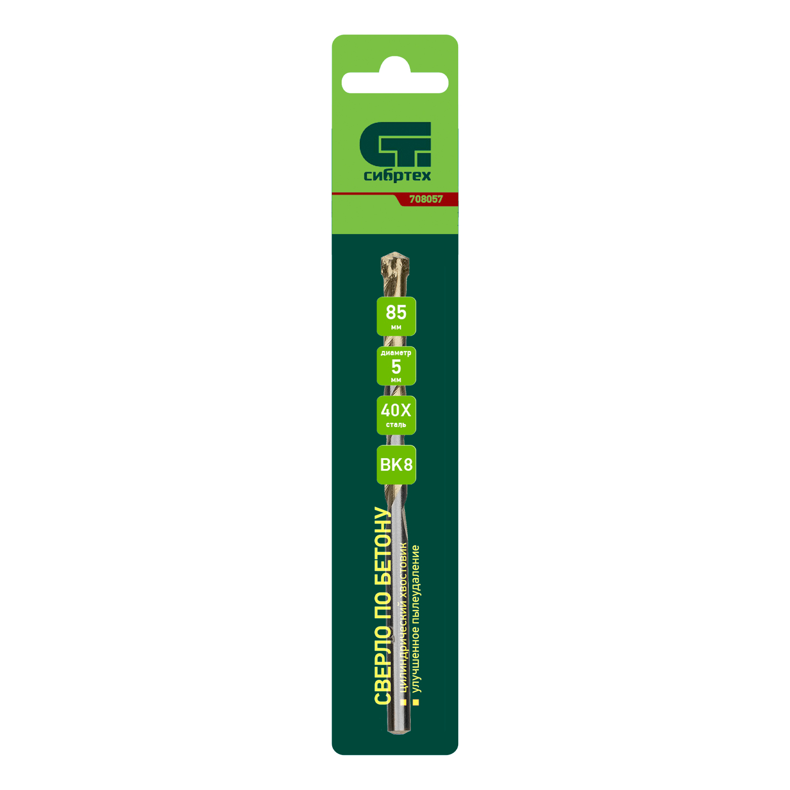 Сверло по бетону Сибртех 708057 диаметром 5 мм и длиной 85 мм, с цилиндрическим хвостовиком и улучшенным пылеудалением, предназначено для сверления в ударном режиме бетона и кирпича. Пригодится во время строительных и ремонтных работ.