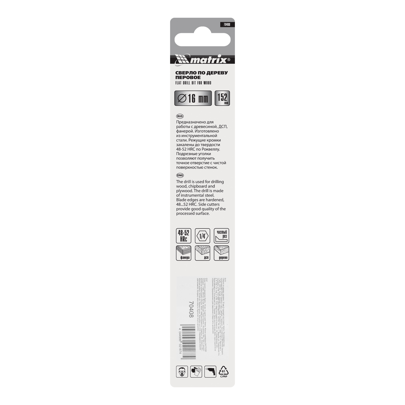 Перовое сверло по дереву Matrix 70408 диаметром 16 мм, с 6-гранным хвостовиком, имеет рабочую часть в виде «лопатки» с режущими кромками по бокам, поэтому эффективно для сверления глубоких сквозных и глухих отверстий. Оснастка устанавливается на ручную механическую или электрическую дрель, сверлильный станок, с ее помощью можно сверлить древесину любых пород.
