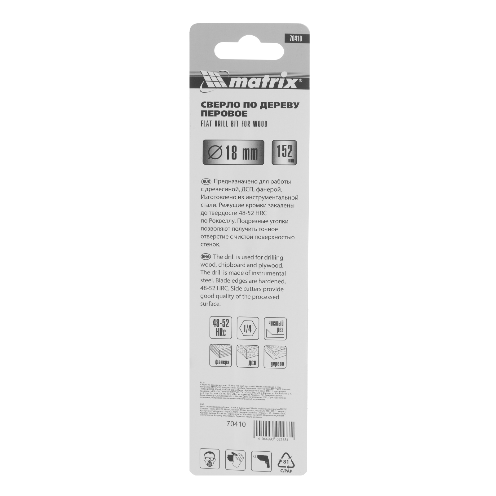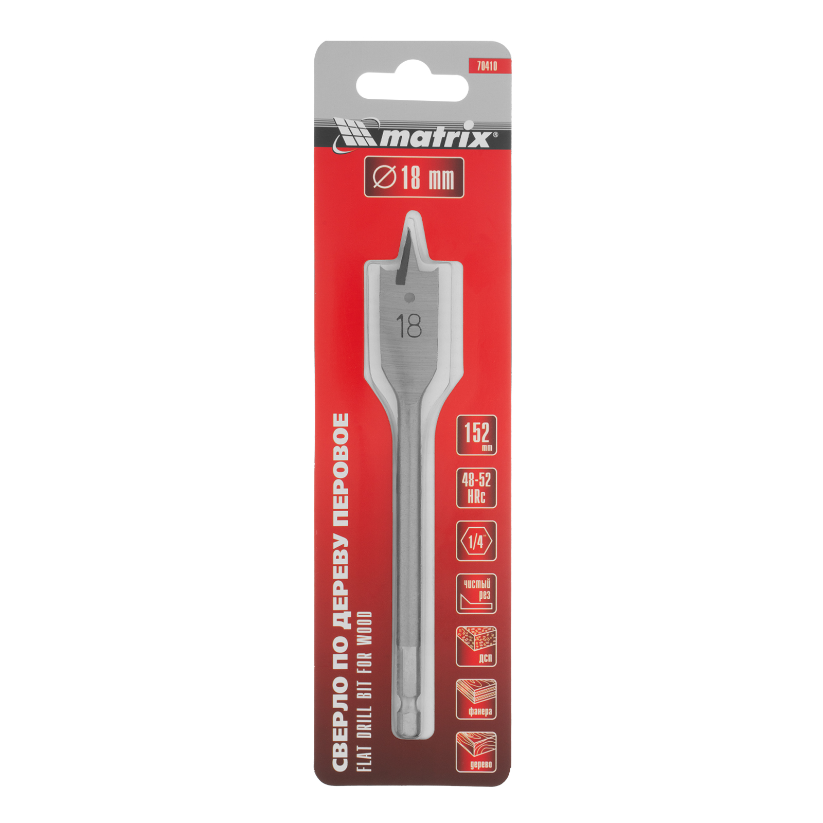 Перовое сверло по дереву Matrix 70410 диаметром 18 мм, с 6-гранным хвостовиком, имеет рабочую часть в виде «лопатки» с режущими кромками по бокам, поэтому эффективно для сверления глубоких сквозных и глухих отверстий. Оснастка устанавливается на ручную механическую или электрическую дрель, сверлильный станок, с ее помощью можно сверлить древесину любых пород.