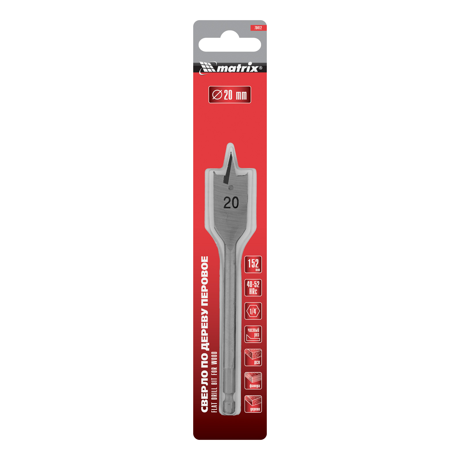 Перовое сверло по дереву Matrix 70412 диаметром 20 мм, с 6-гранным хвостовиком, имеет рабочую часть в виде «лопатки» с режущими кромками по бокам, поэтому эффективно для сверления глубоких сквозных и глухих отверстий. Оснастка устанавливается на ручную механическую или электрическую дрель, сверлильный станок, с ее помощью можно сверлить древесину любых пород.