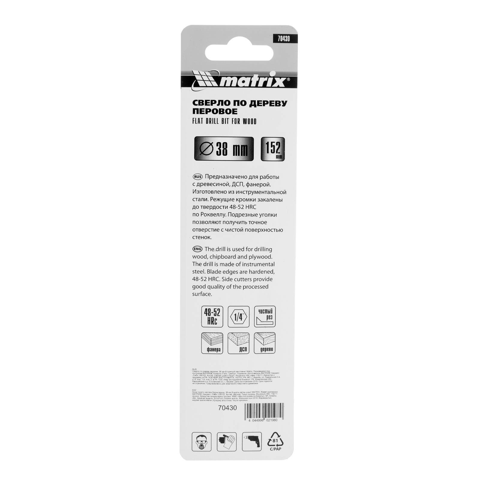 Перовое сверло по дереву Matrix 70430 диаметром 38 мм, с 6-гранным хвостовиком, имеет рабочую часть в виде «лопатки» с режущими кромками по бокам, поэтому эффективно для сверления глубоких сквозных и глухих отверстий. Оснастка устанавливается на ручную механическую или электрическую дрель, сверлильный станок, с ее помощью можно сверлить древесину любых пород.