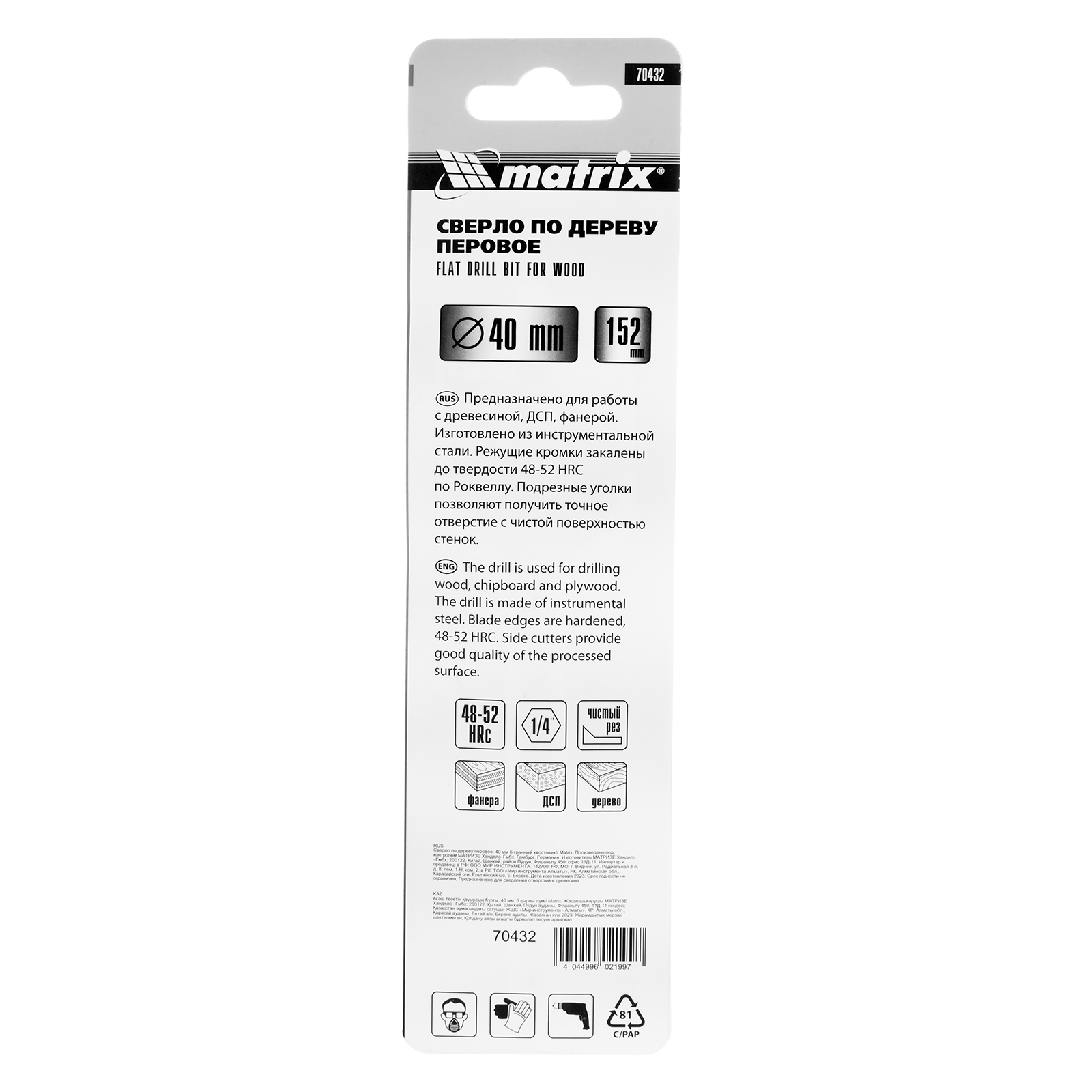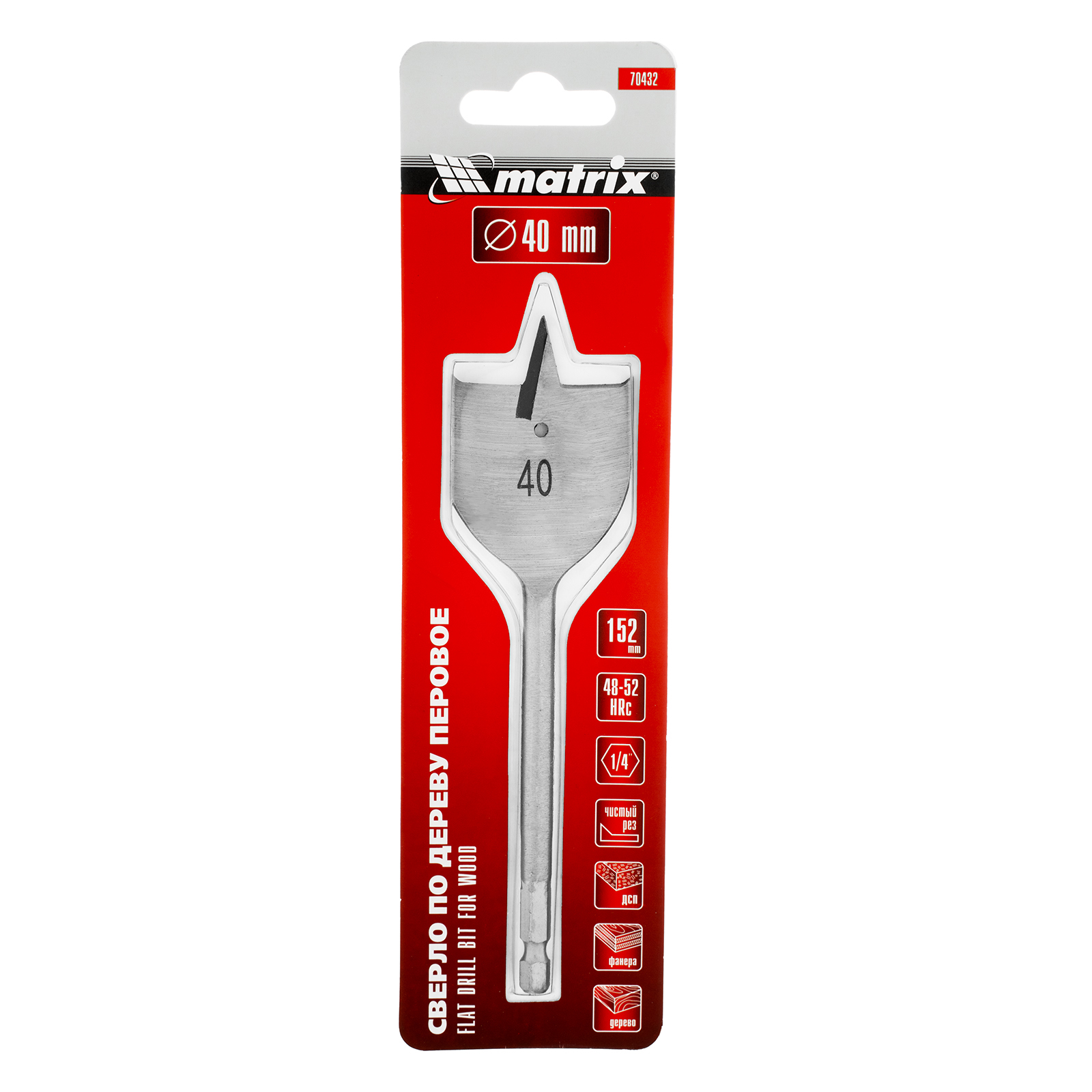 Перовое сверло по дереву Matrix 70432 диаметром 40 мм, с 6-гранным хвостовиком, имеет рабочую часть в виде «лопатки» с режущими кромками по бокам, поэтому эффективно для сверления глубоких сквозных и глухих отверстий. Оснастка устанавливается на ручную механическую или электрическую дрель, сверлильный станок, с ее помощью можно сверлить древесину любых пород.