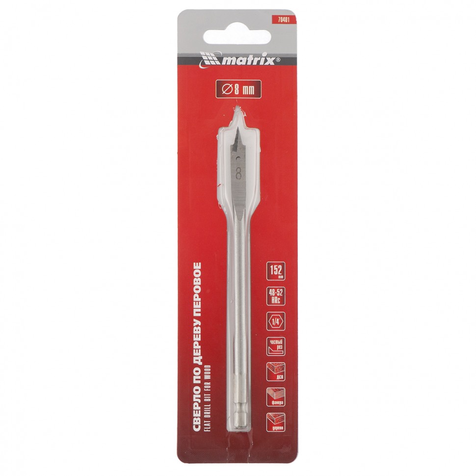 Перовое сверло по дереву Matrix 70401 диаметром 8 мм, с 6-гранным хвостовиком, имеет рабочую часть в виде «лопатки» с режущими кромками по бокам, поэтому эффективно для сверления глубоких сквозных и глухих отверстий. Устанавливается на ручную механическую, электрическую дрель или шуруповерт, эффективно для сверления древесины любых пород.