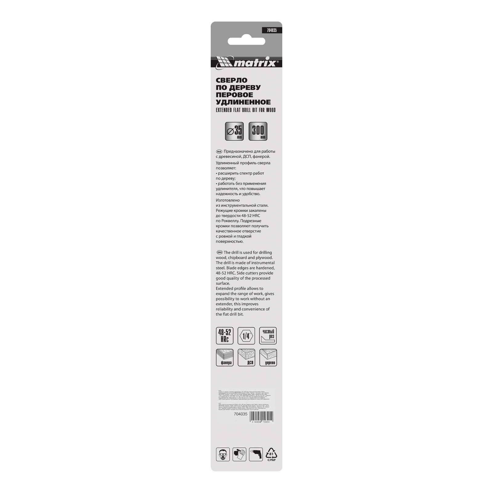 Удлиненное перовое сверло по дереву Matrix 704035 диаметром 35 мм, с 6-гранным хвостовиком, за счет длины 300 мм позволяет получать глубокие отверстия без необходимости использования удлинителя. Эффективно сверлит древесину любой твердости.