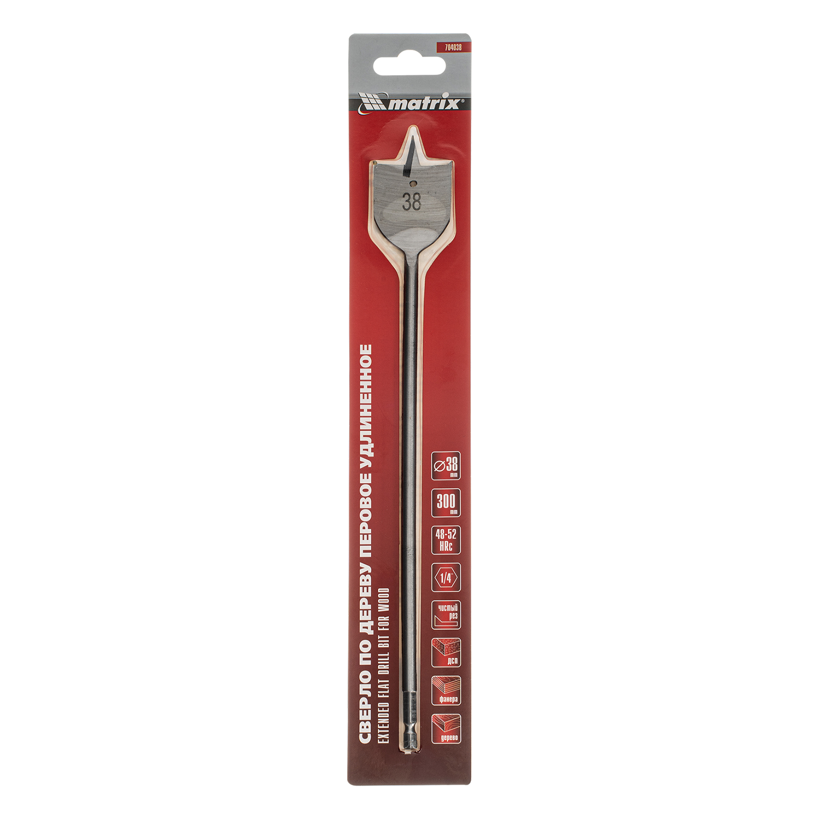Удлиненное перовое сверло по дереву Matrix 704038 диаметром 38 мм, с 6-гранным хвостовиком, за счет длины 300 мм позволяет получать глубокие отверстия без необходимости использования удлинителя. Эффективно сверлит древесину любой твердости.