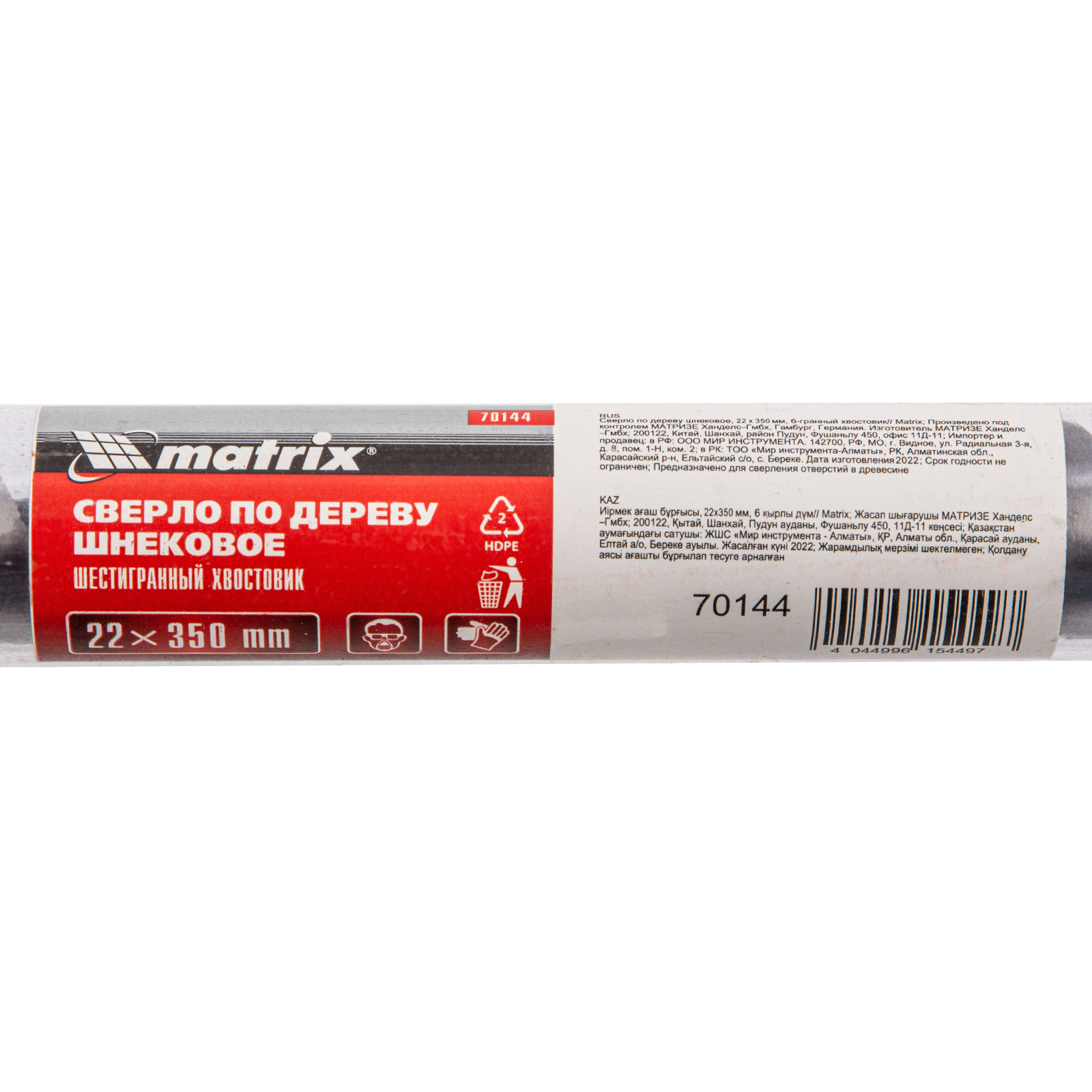 Шнековое сверло по дереву Matrix 70144 размером 22 х 350 мм, с 6-гранным хвостовиком, предназначено для получения глубоких отверстий. Подходит для работы как с мягкими, так и с твердыми породами древесины. Конструкция сверла рассчитана на интенсивное использование с высокими нагрузками в ходе строительных, ремонтных и отделочных работ.
