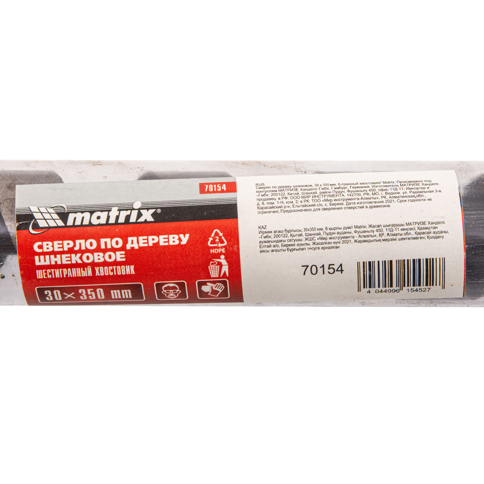 Шнековое сверло по дереву Matrix 70154 размером 30 х 350 мм, с 6-гранным хвостовиком, предназначено для получения глубоких отверстий. Подходит для работы как с мягкими, так и с твердыми породами древесины. Конструкция сверла рассчитана на интенсивное использование с высокими нагрузками в ходе строительных, ремонтных и отделочных работ.