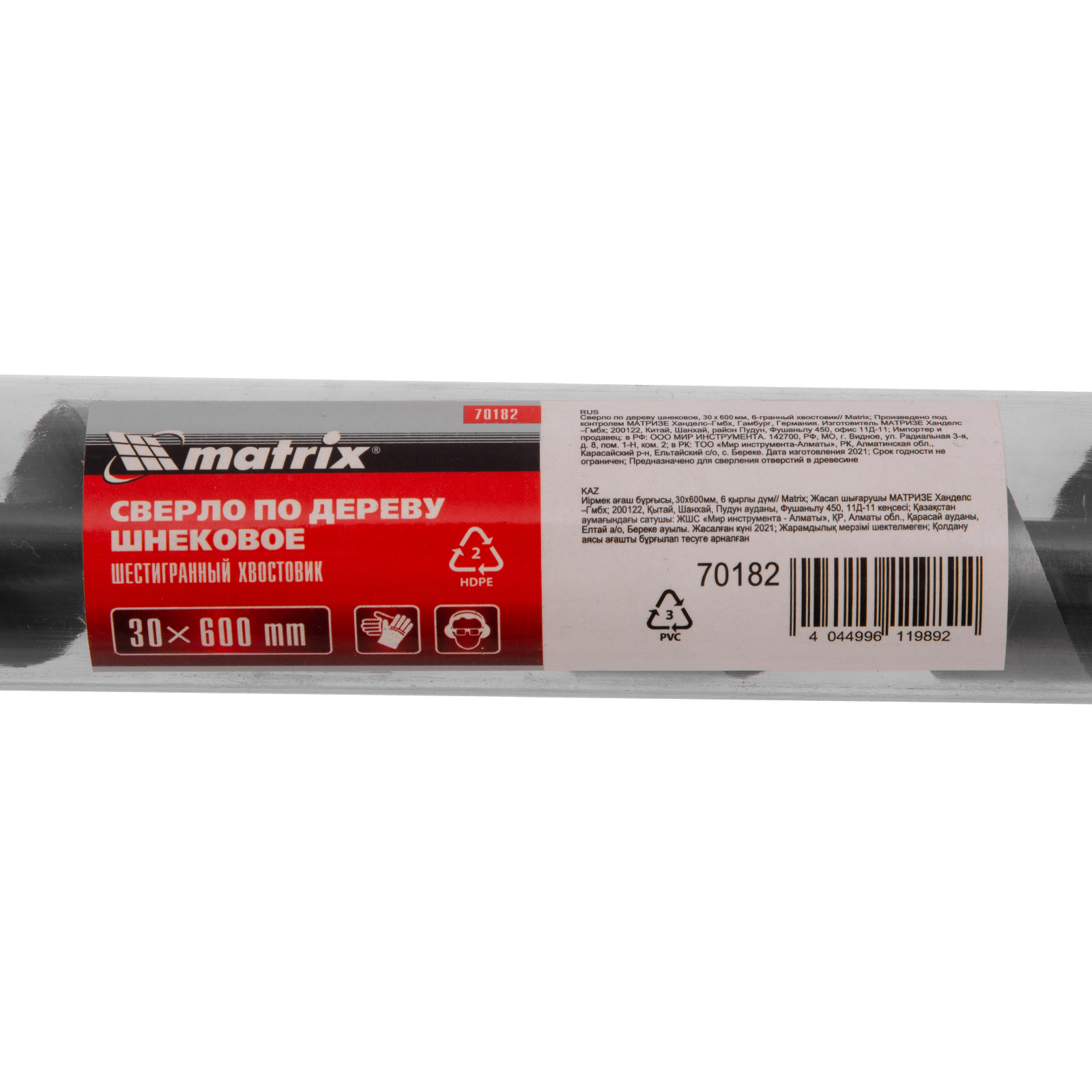 Шнековое сверло по дереву Matrix 70182 размером 30 х 600 мм, с 6-гранным хвостовиком, предназначено для получения глубоких отверстий. Подходит для работы как с мягкими, так и с твердыми породами древесины. Конструкция сверла рассчитана на интенсивное использование с высокими нагрузками в ходе строительных, ремонтных и отделочных работ.