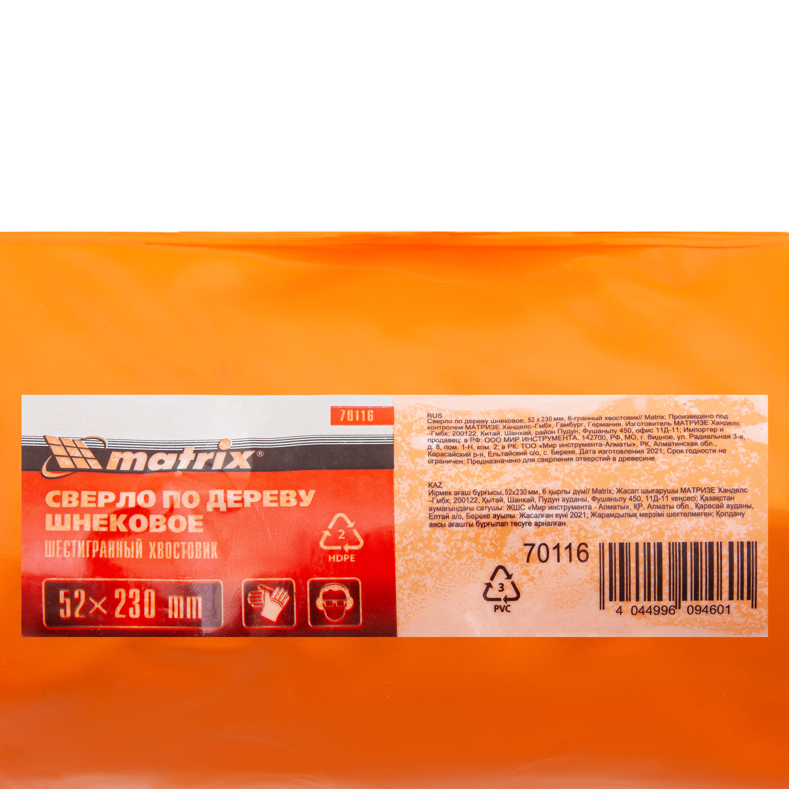 Шнековое сверло по дереву Matrix 70116 размером 52 х 230 мм, с 6-гранным хвостовиком, предназначено для получения глубоких отверстий. Подходит для работы как с мягкими, так и с твердыми породами древесины. Конструкция сверла рассчитана на интенсивное использование с высокими нагрузками в ходе строительных, ремонтных и отделочных работ.