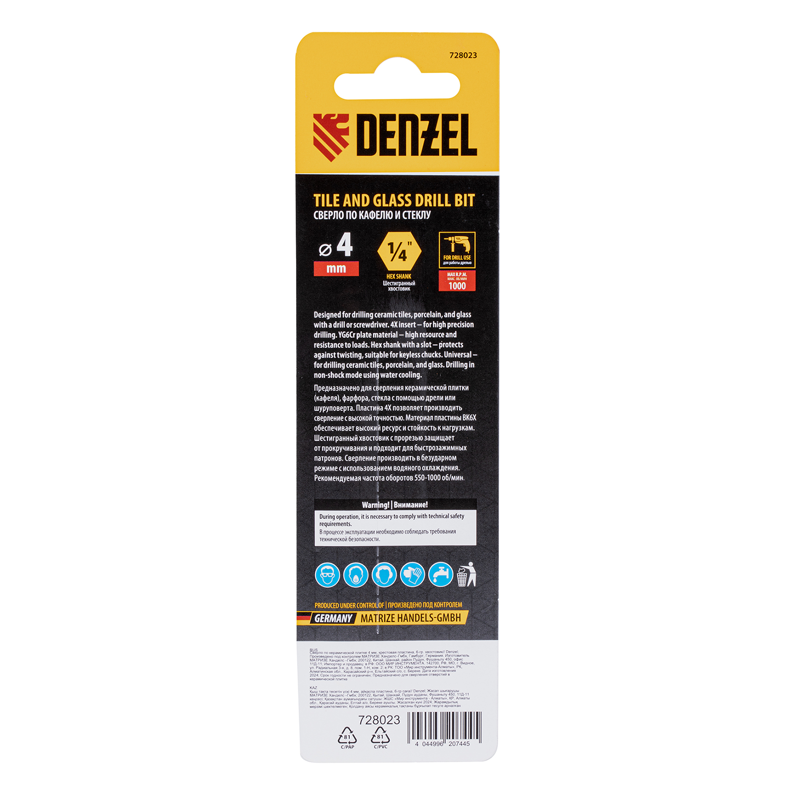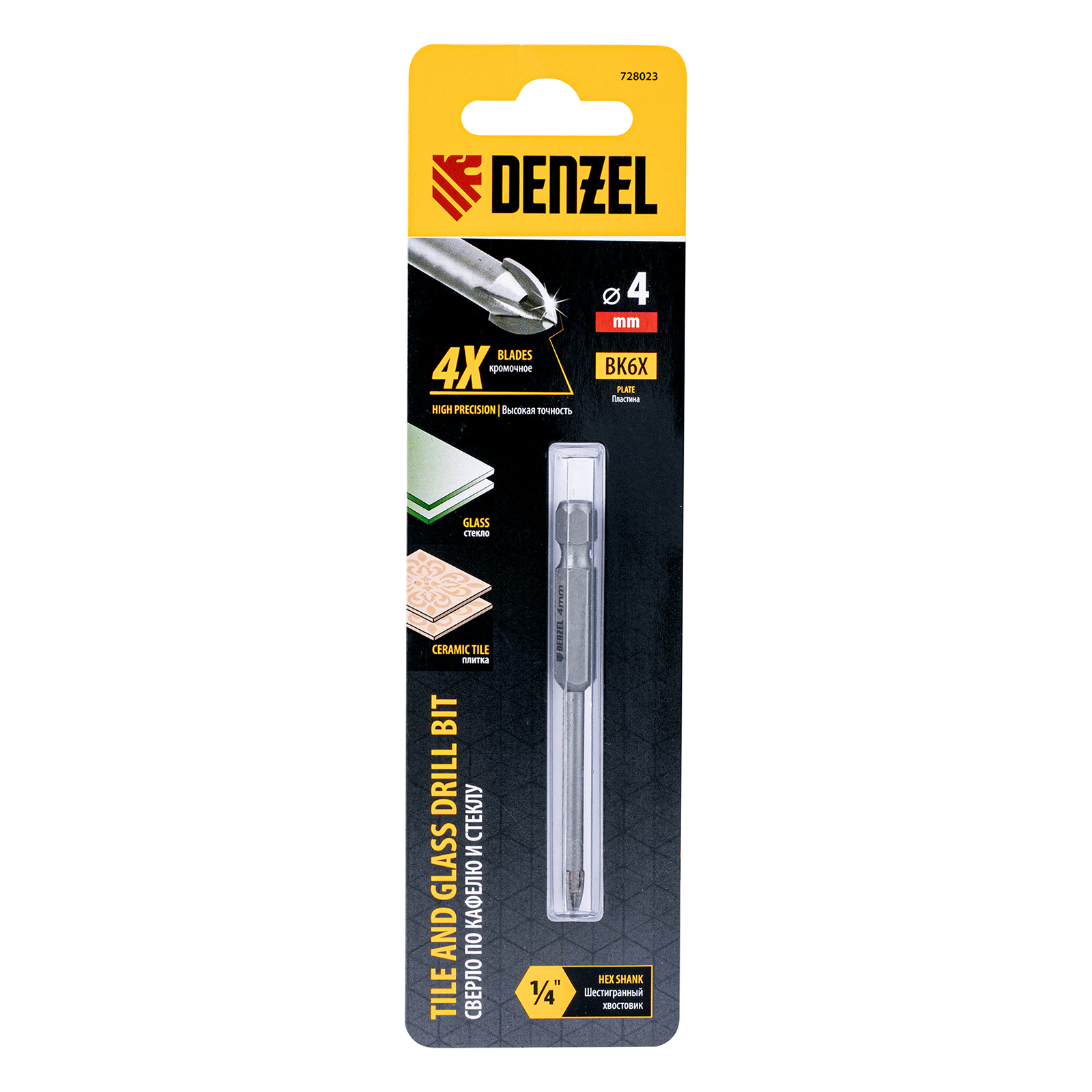 Сверло Denzel 728023 диаметром 4 мм, с крестовой пластиной и шестигранным хвостовиком, используется для сверления керамической плитки, стекла и других материалов с помощью дрели или шуруповерта. Четырехкромочная режущая пластина обеспечивает высокую скорость засверливания. Оснастка выдерживает высокие нагрузки и подходит для интенсивного профессионального использования.