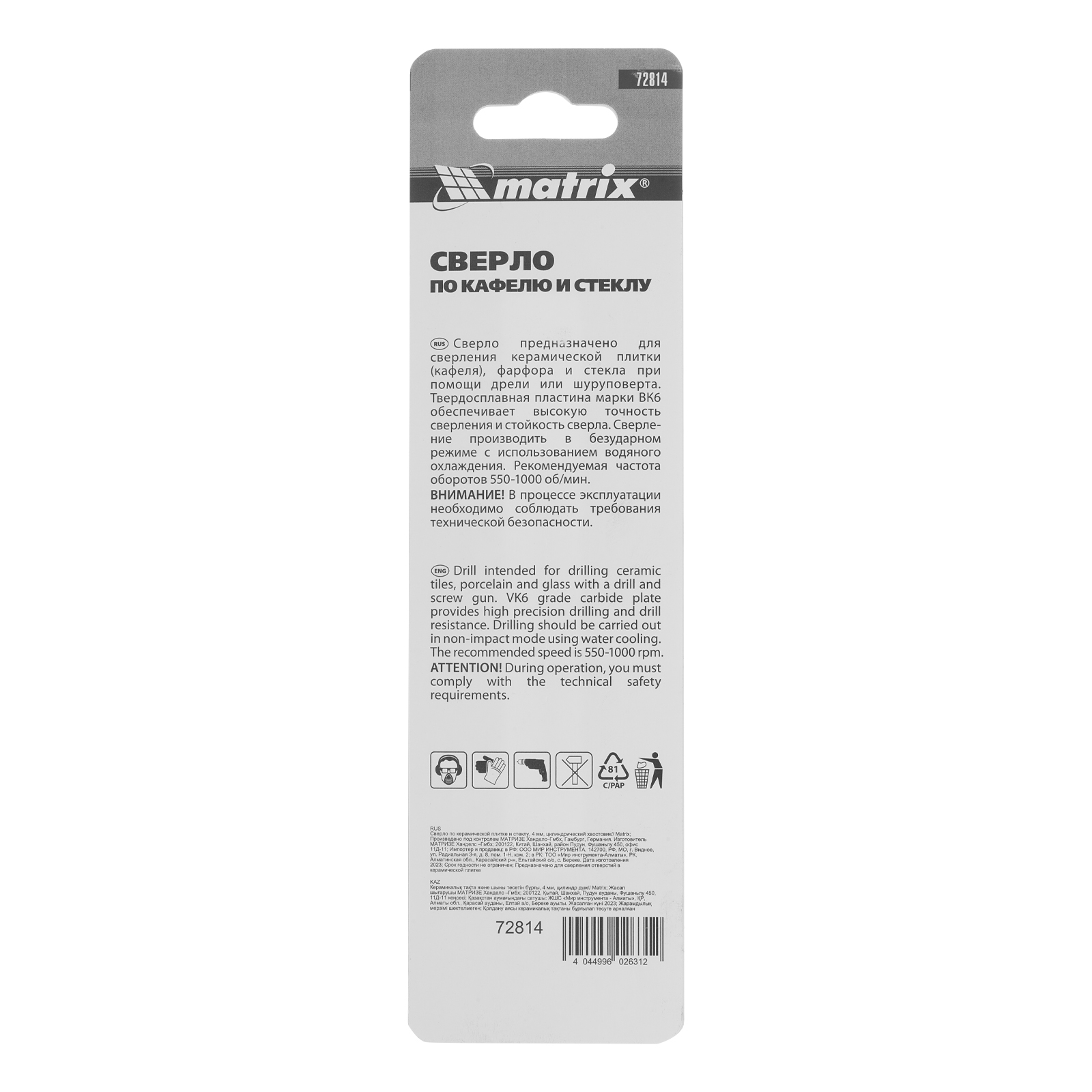Сверло Matrix 72814 с цилиндрическим хвостовиком пригодится для получения отверстий диаметром 4 мм в керамической плитке и стекле. Пикообразная режущая часть обеспечивает быстрое засверливание. Сверло оптимально для бытовых работ. Рекомендуется использовать его с дрелью или шуруповертом в безударном режиме на рабочих оборотах 550-1000 об/мин.