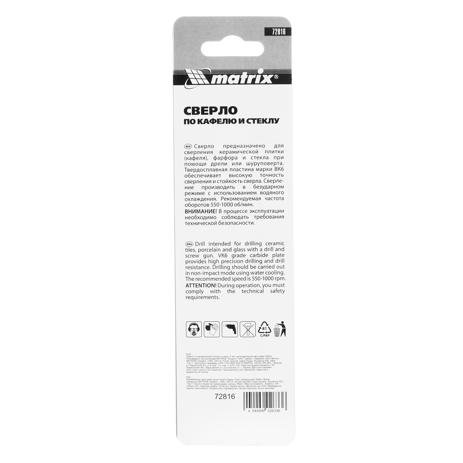 Сверло Matrix 72816 с цилиндрическим хвостовиком пригодится для получения отверстий диаметром 6 мм в керамической плитке и стекле. Пикообразная режущая часть обеспечивает быстрое засверливание. Сверло оптимально для бытовых работ. Рекомендуется использовать его с дрелью или шуруповертом в безударном режиме на рабочих оборотах 550-1000 об/мин.