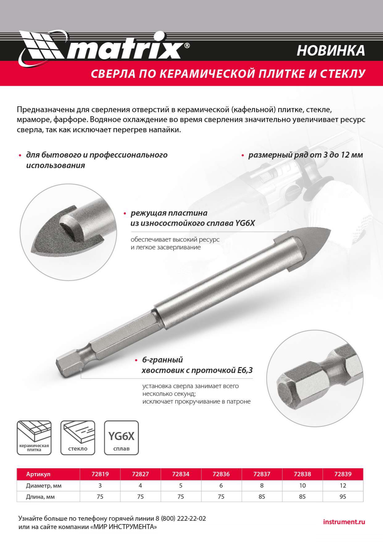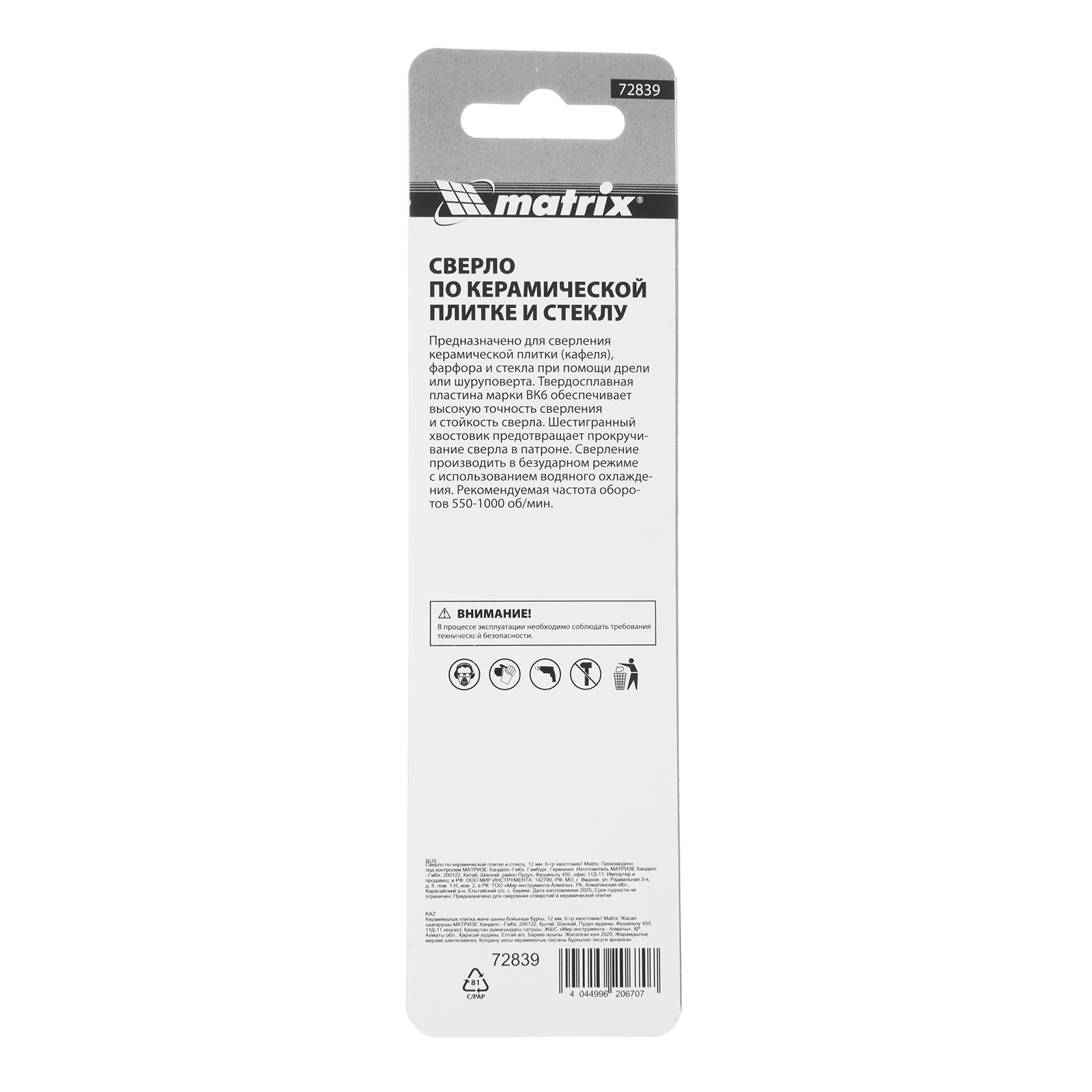 Сверло Matrix 72839 диаметром 12 мм, с шестигранным хвостовиком, используется для сверления керамической плитки, стекла и других материалов с помощью дрели или шуруповерта. Выдерживает высокие нагрузки и подходит для интенсивного использования.