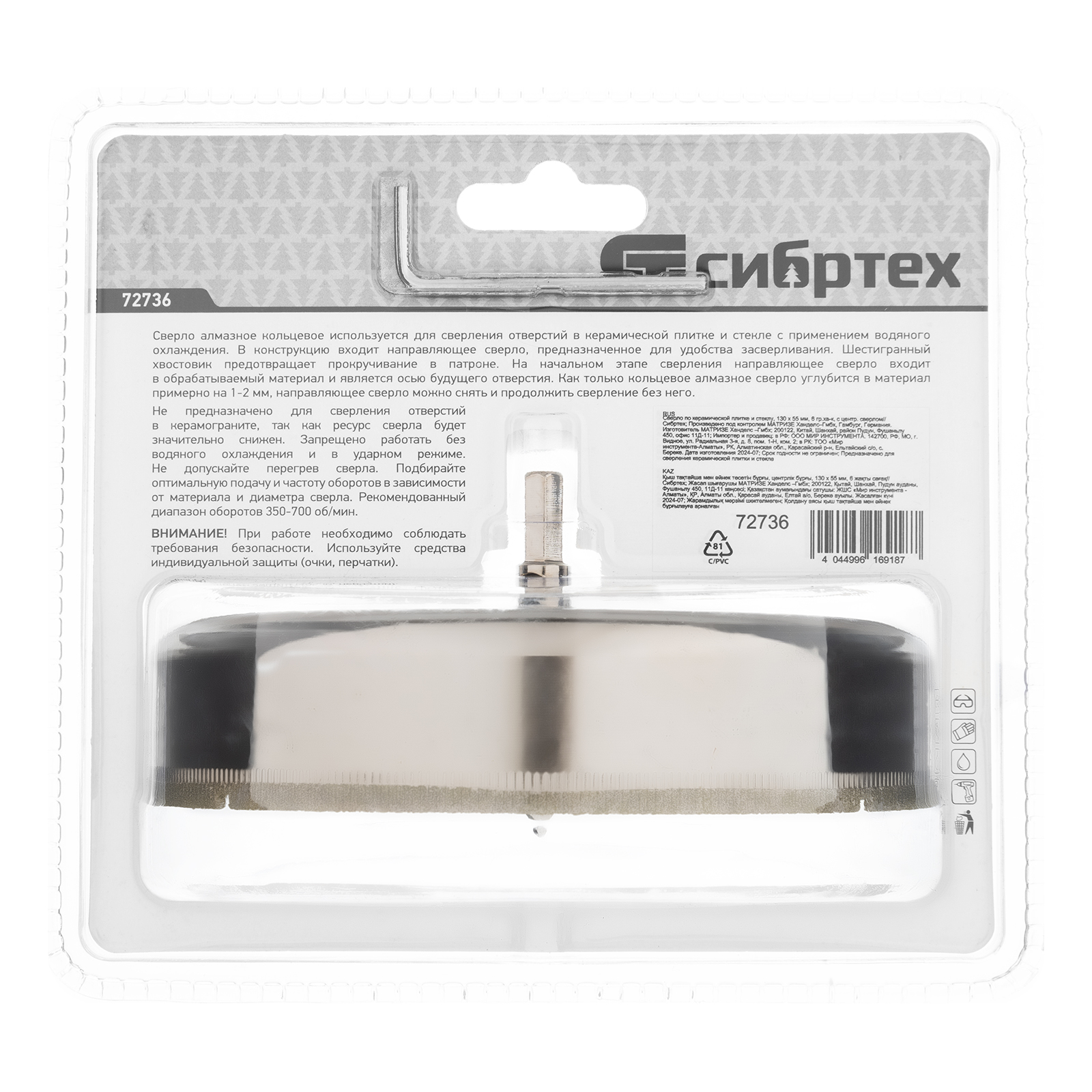 Сверло Сибртех 72736 размером 130 х 55 м, с шестигранным хвостовиком и центрирующим сверлом, позволяет получать отверстия в керамической плитке и стекле. Его устанавливают на дрель или шуруповерт, рекомендуемый диапазон рабочих оборотов 350-700 об/мин. Оснастка используется при выполнении бытовых ремонтных и отделочных работ.
