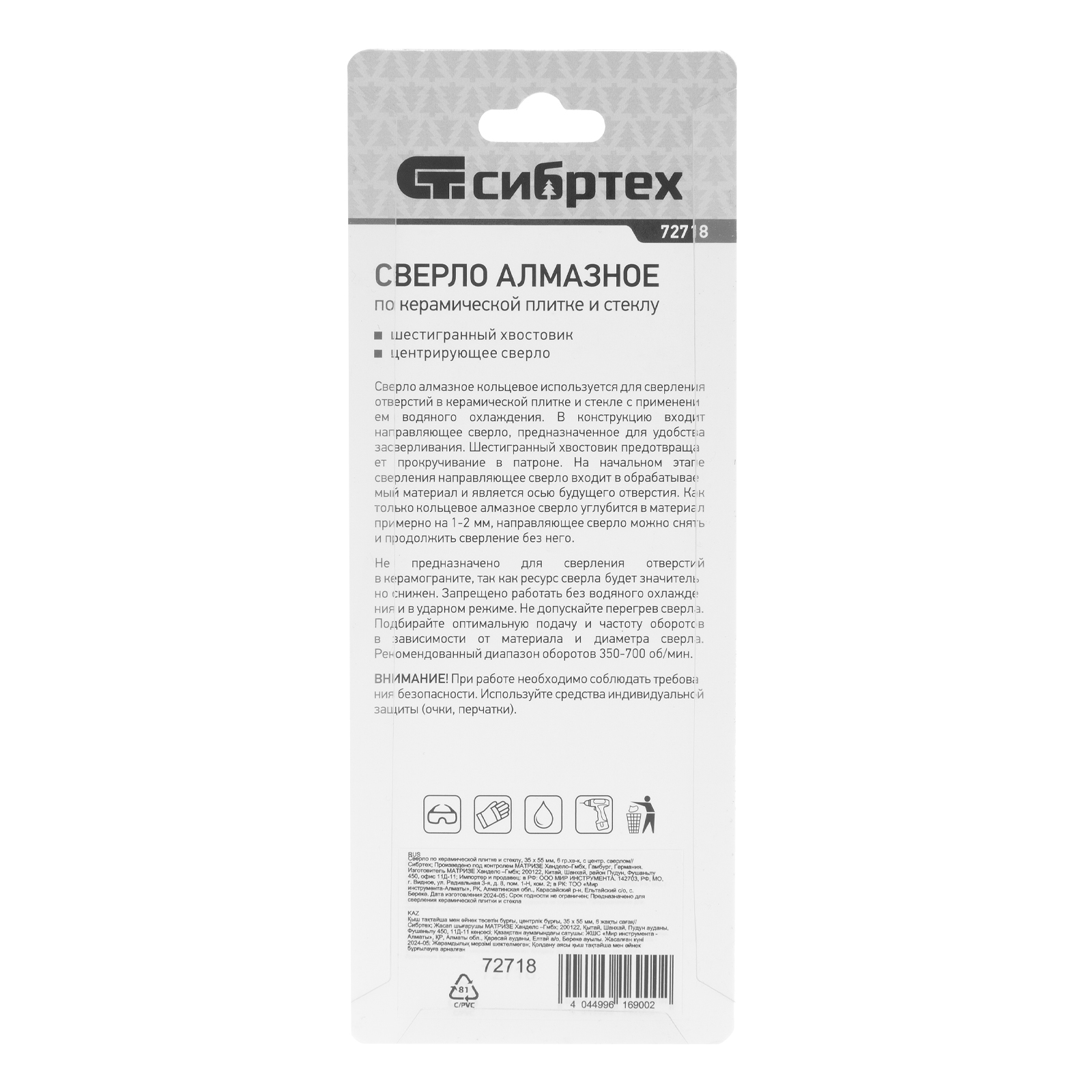 Сверло Сибртех 72718 размером 35 х 55 м, с шестигранным хвостовиком и центрирующим сверлом, позволяет получать отверстия в керамической плитке и стекле. Его устанавливают на дрель или шуруповерт, рекомендуемый диапазон рабочих оборотов 350-700 об/мин. Оснастка используется при выполнении бытовых ремонтных и отделочных работ.