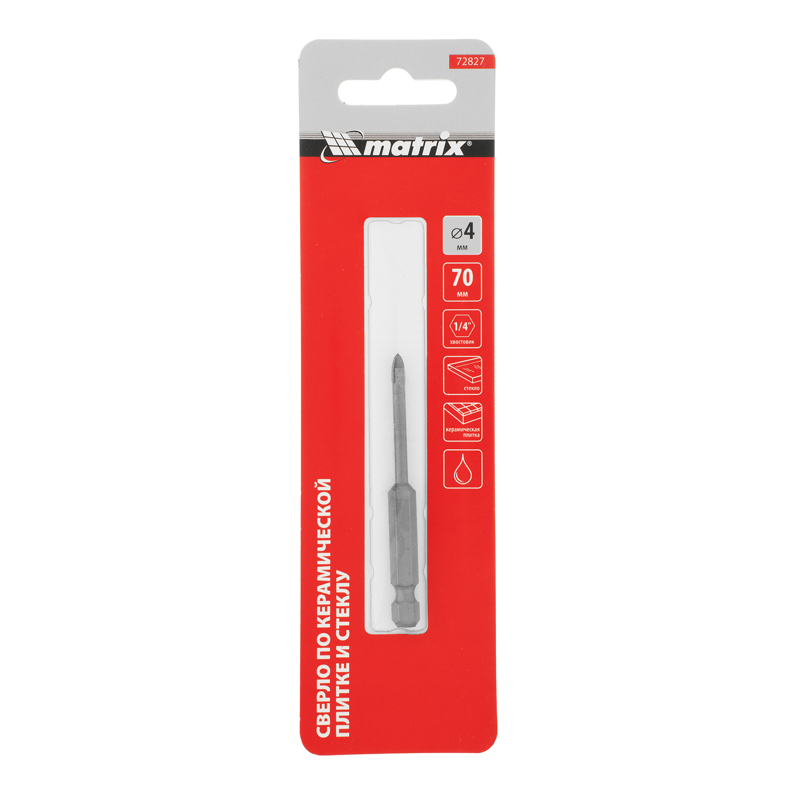 Сверло Matrix 72827 диаметром 4 мм, с шестигранным хвостовиком, используется для сверления керамической плитки, стекла и других материалов с помощью дрели или шуруповерта. Выдерживает высокие нагрузки и подходит для интенсивного использования.