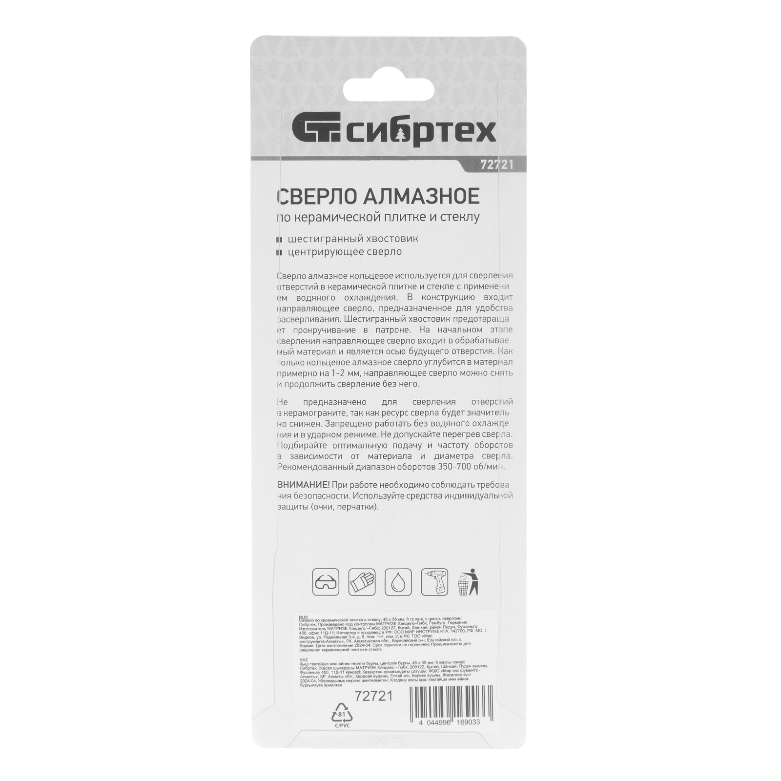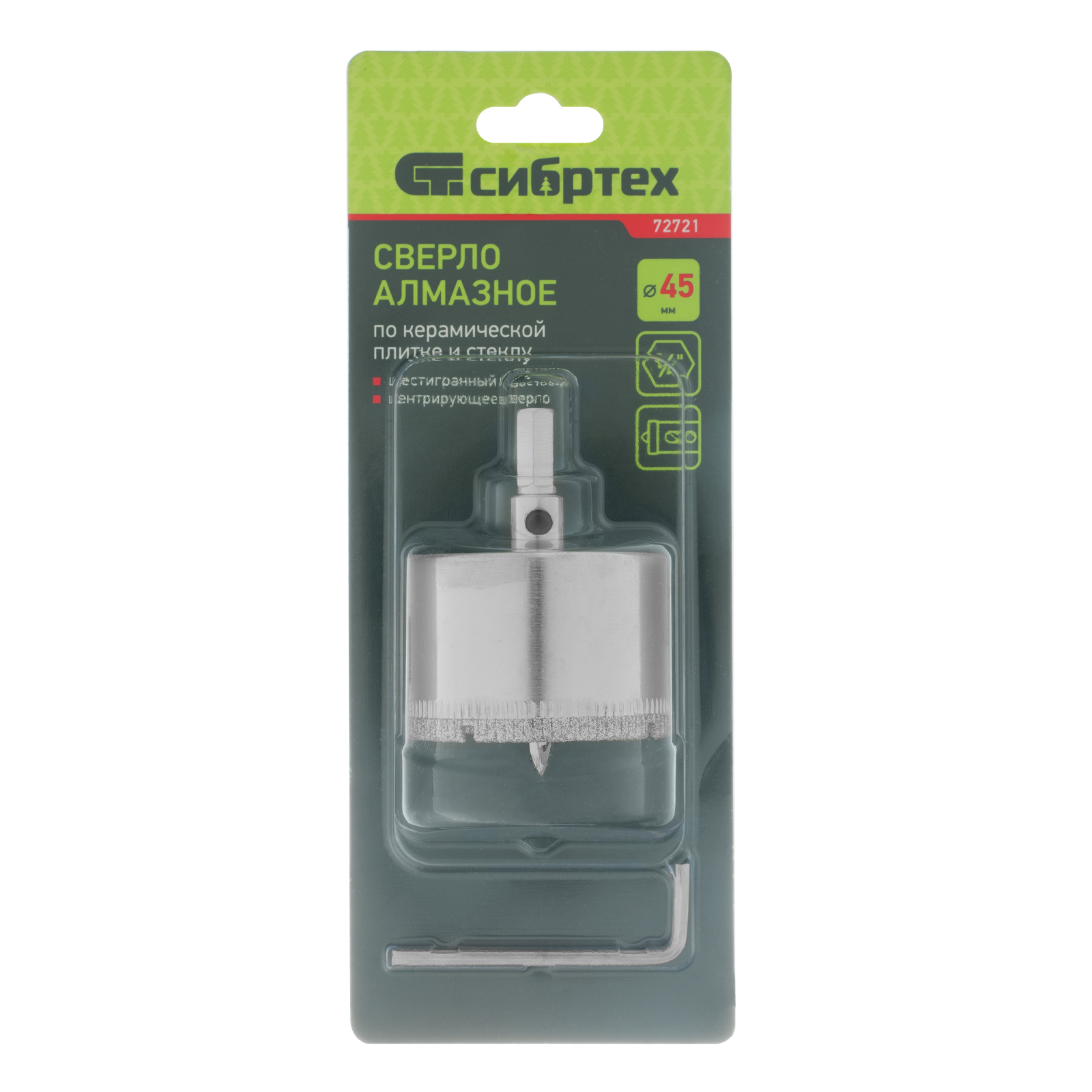 Сверло Сибртех 72721 размером 45 х 55 м, с шестигранным хвостовиком и центрирующим сверлом, позволяет получать отверстия в керамической плитке и стекле. Его устанавливают на дрель или шуруповерт, рекомендуемый диапазон рабочих оборотов 350-700 об/мин. Оснастка используется при выполнении бытовых ремонтных и отделочных работ.