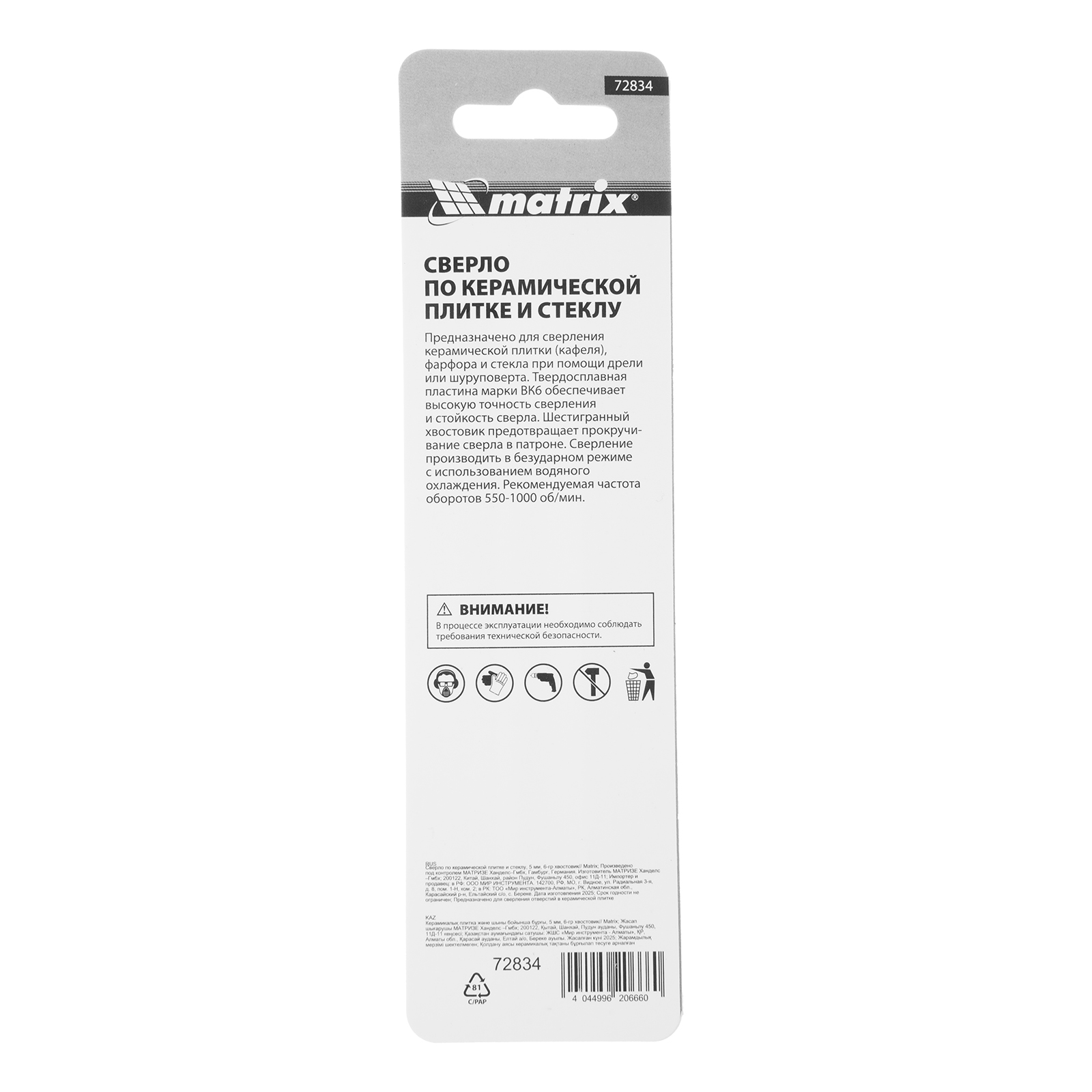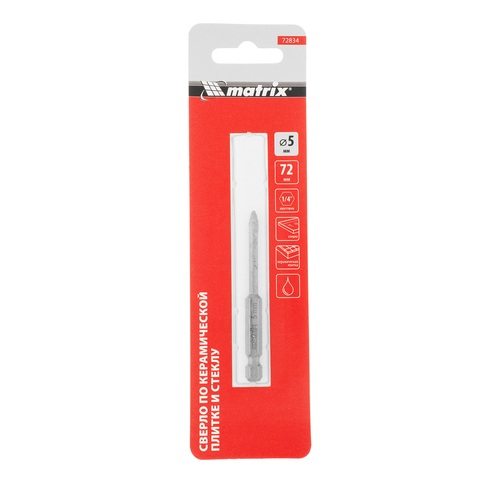 Сверло Matrix 72834 диаметром 5 мм, с шестигранным хвостовиком, используется для сверления керамической плитки, стекла и других материалов с помощью дрели или шуруповерта. Выдерживает высокие нагрузки и подходит для интенсивного использования.