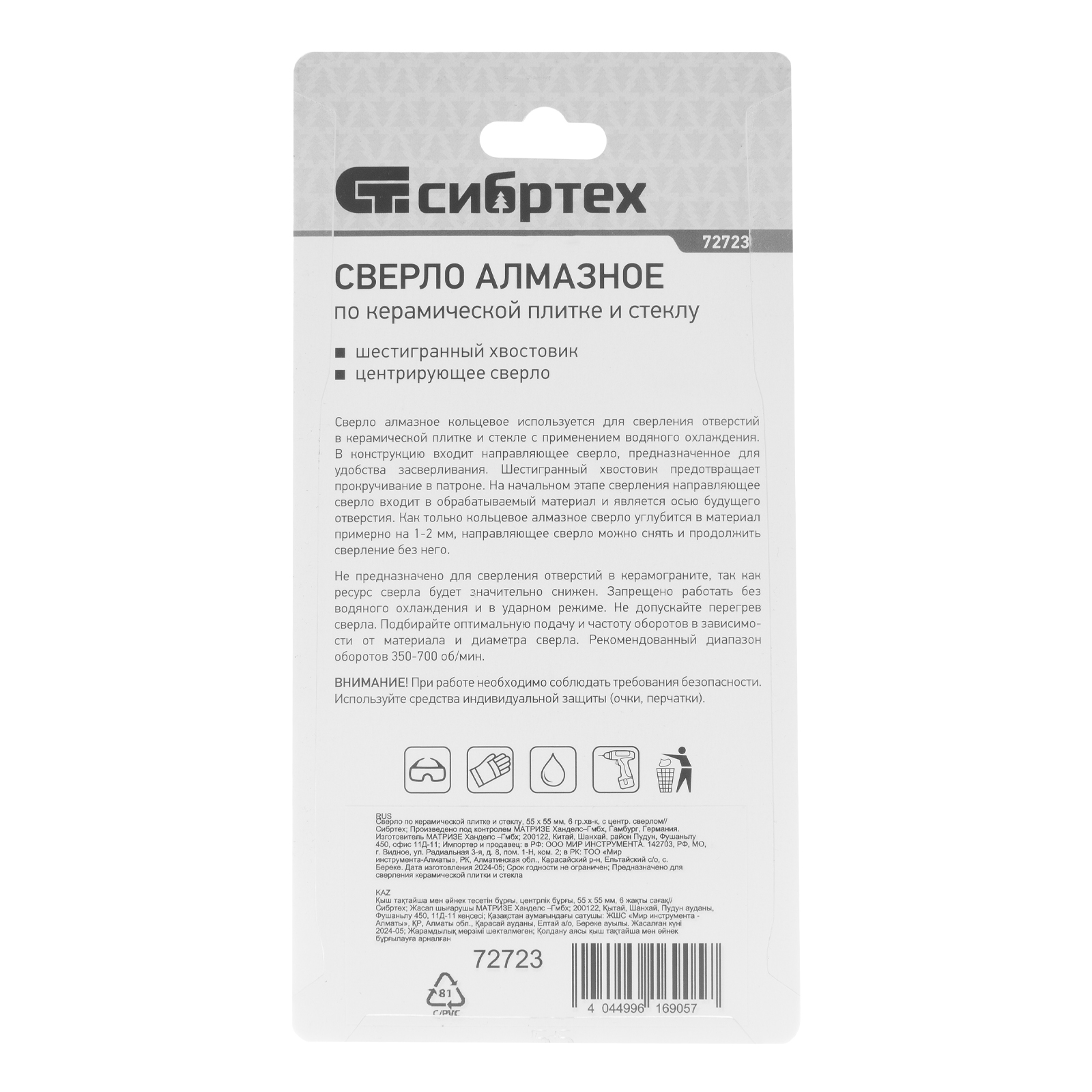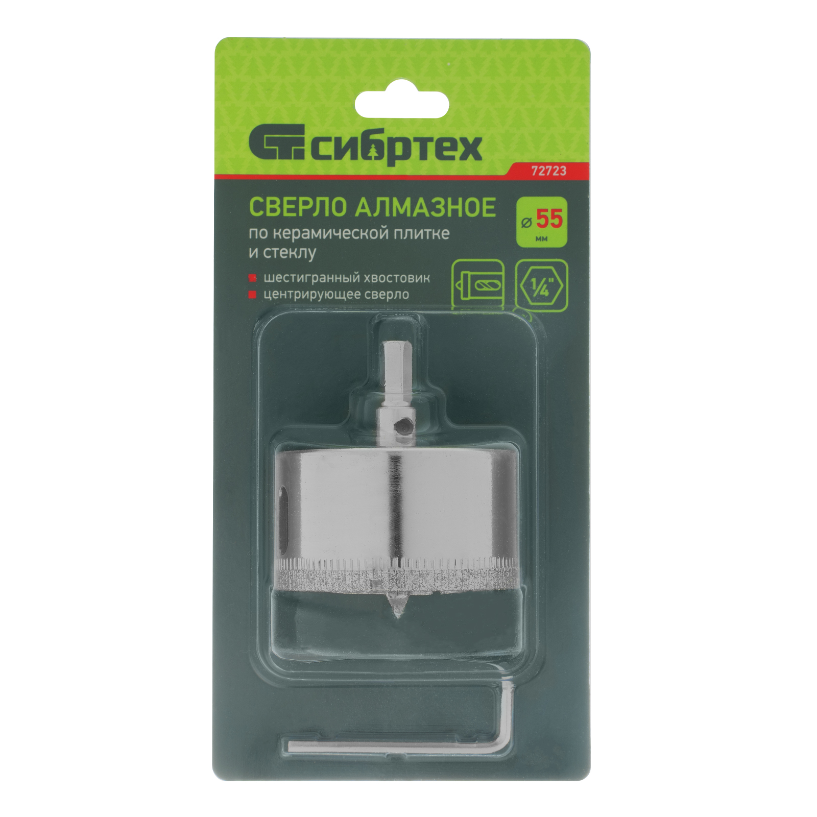Сверло Сибртех 72723 размером 55 х 55 м, с шестигранным хвостовиком и центрирующим сверлом, позволяет получать отверстия в керамической плитке и стекле. Его устанавливают на дрель или шуруповерт, рекомендуемый диапазон рабочих оборотов 350-700 об/мин. Оснастка используется при выполнении бытовых ремонтных и отделочных работ.