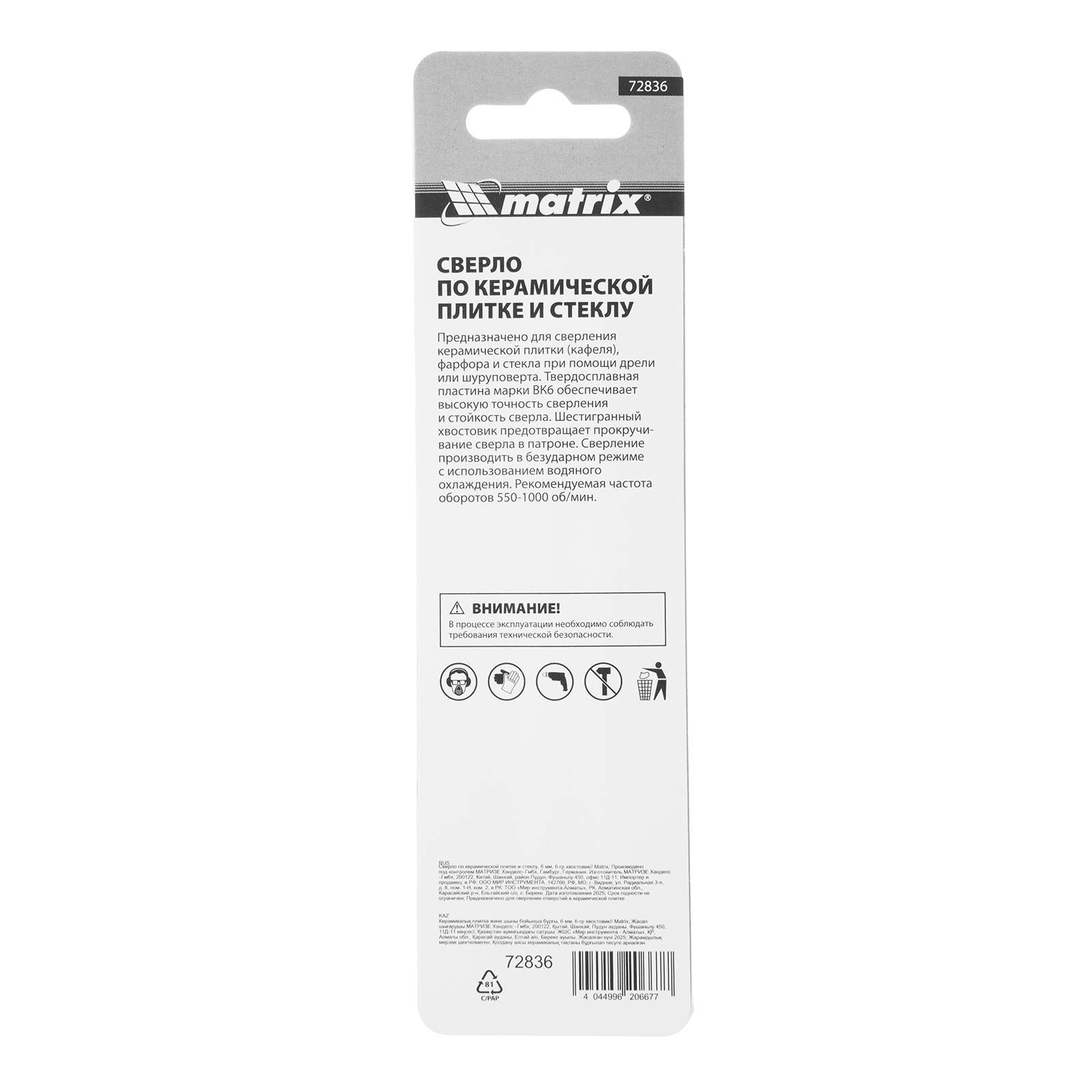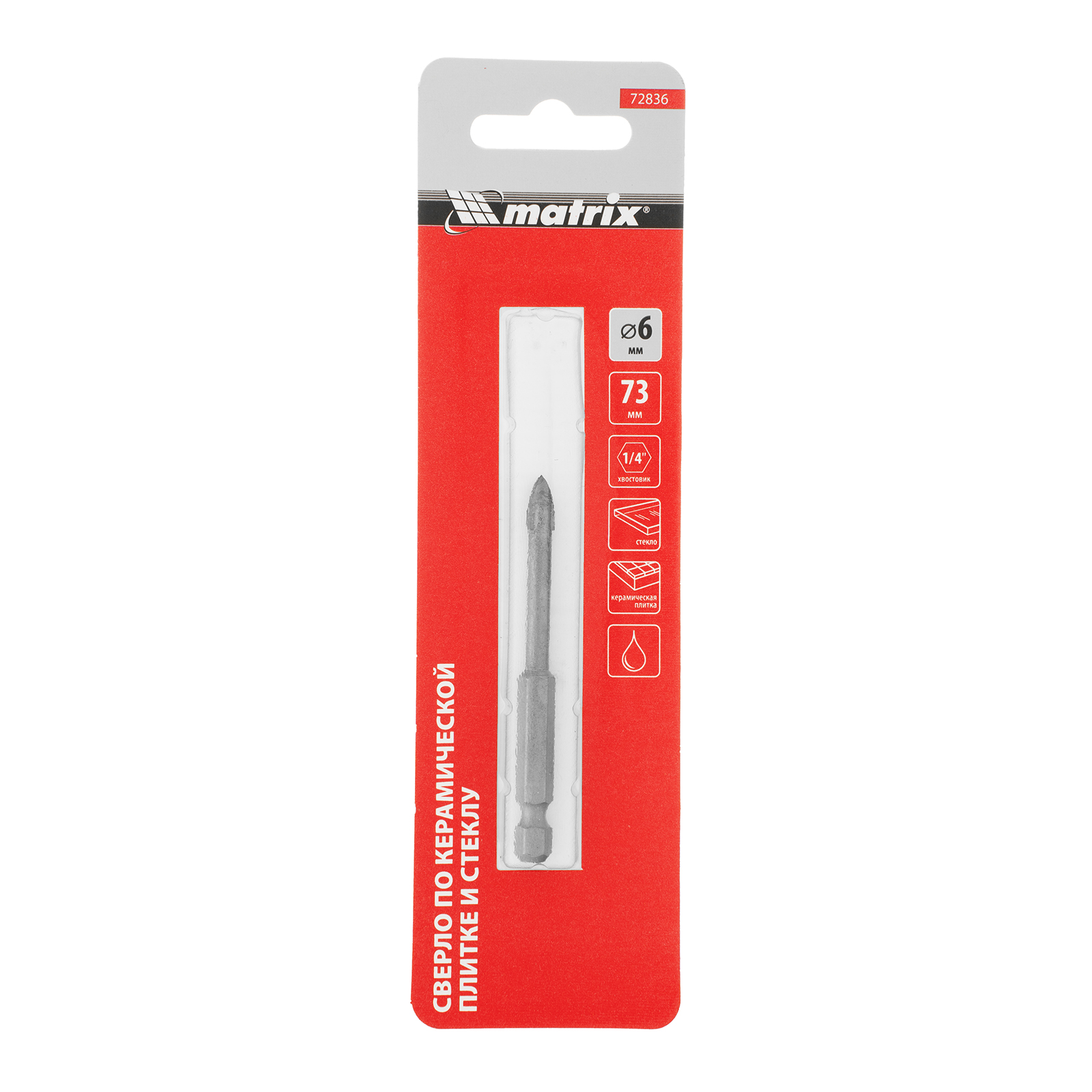 Сверло Matrix 72836 диаметром 6 мм, с шестигранным хвостовиком, используется для сверления керамической плитки, стекла и других материалов с помощью дрели или шуруповерта. Выдерживает высокие нагрузки и подходит для интенсивного использования.