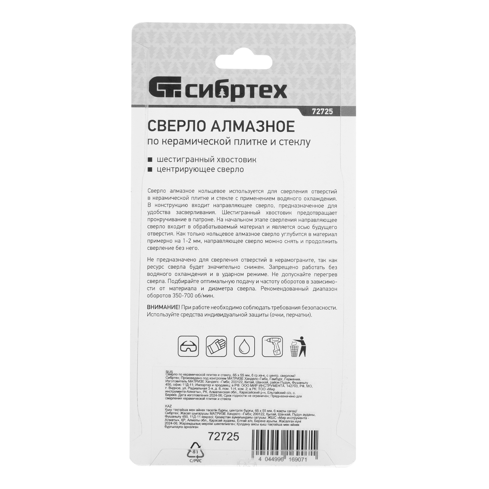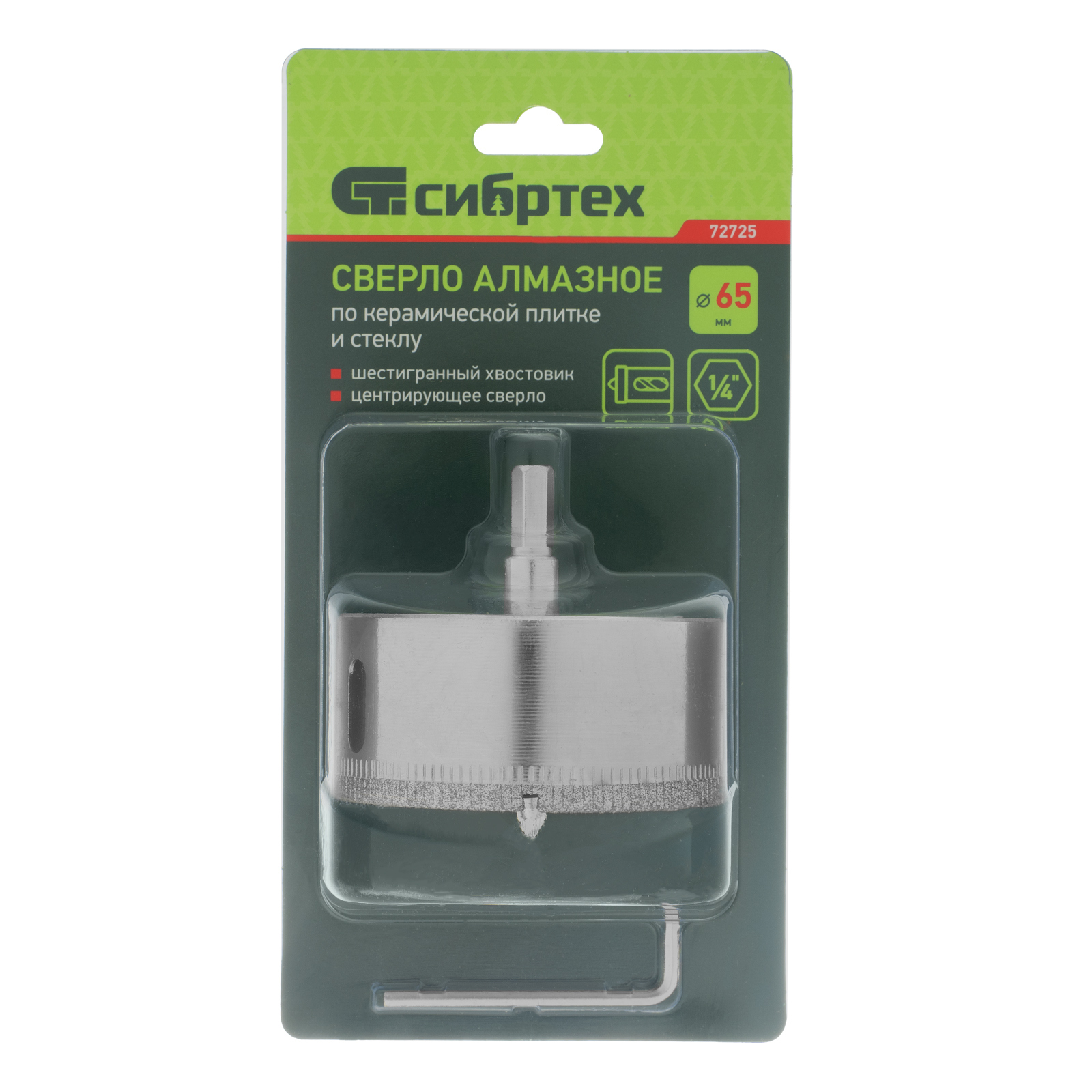 Сверло Сибртех 72725 размером 65 х 55 м, с шестигранным хвостовиком и центрирующим сверлом, позволяет получать отверстия в керамической плитке и стекле. Его устанавливают на дрель или шуруповерт, рекомендуемый диапазон рабочих оборотов 350-700 об/мин. Оснастка используется при выполнении бытовых ремонтных и отделочных работ.