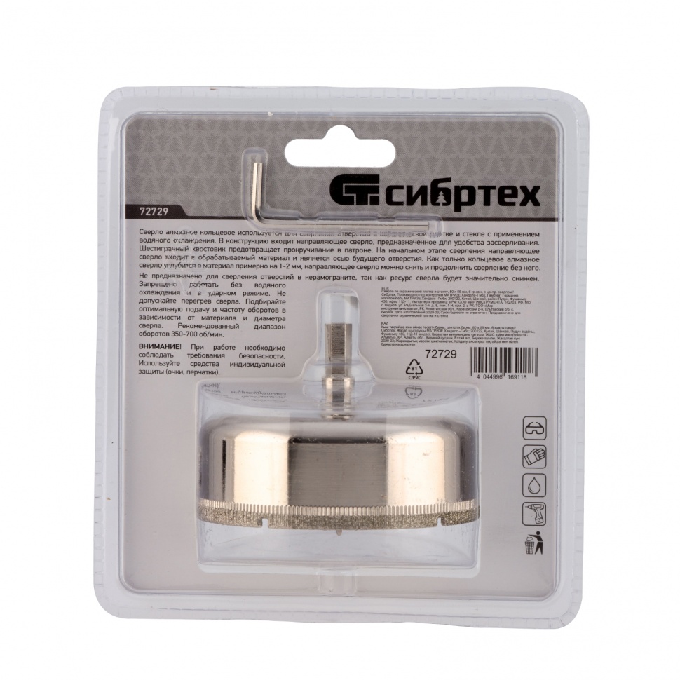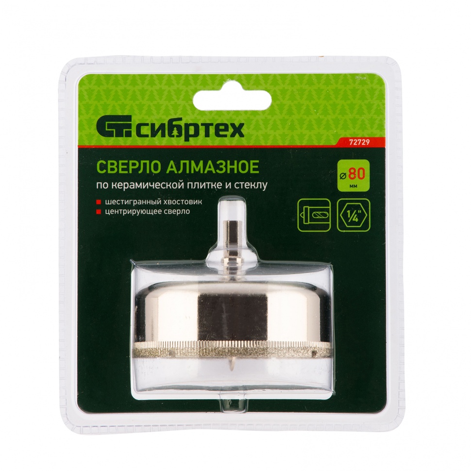 Сверло Сибртех 72729 размером 80 х 55 м, с шестигранным хвостовиком и центрирующим сверлом, позволяет получать отверстия в керамической плитке и стекле. Его устанавливают на дрель или шуруповерт, рекомендуемый диапазон рабочих оборотов 350-700 об/мин. Оснастка используется при выполнении бытовых ремонтных и отделочных работ.