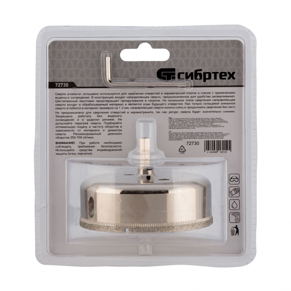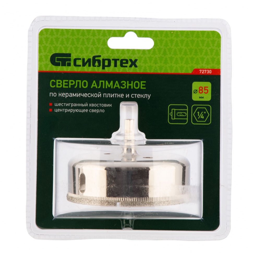 Сверло Сибртех 72730 размером 85 х 55 м, с шестигранным хвостовиком и центрирующим сверлом, позволяет получать отверстия в керамической плитке и стекле. Его устанавливают на дрель или шуруповерт, рекомендуемый диапазон рабочих оборотов 350-700 об/мин. Оснастка используется при выполнении бытовых ремонтных и отделочных работ.