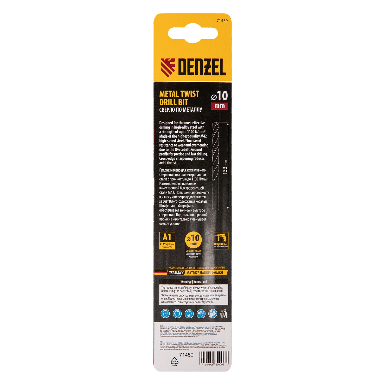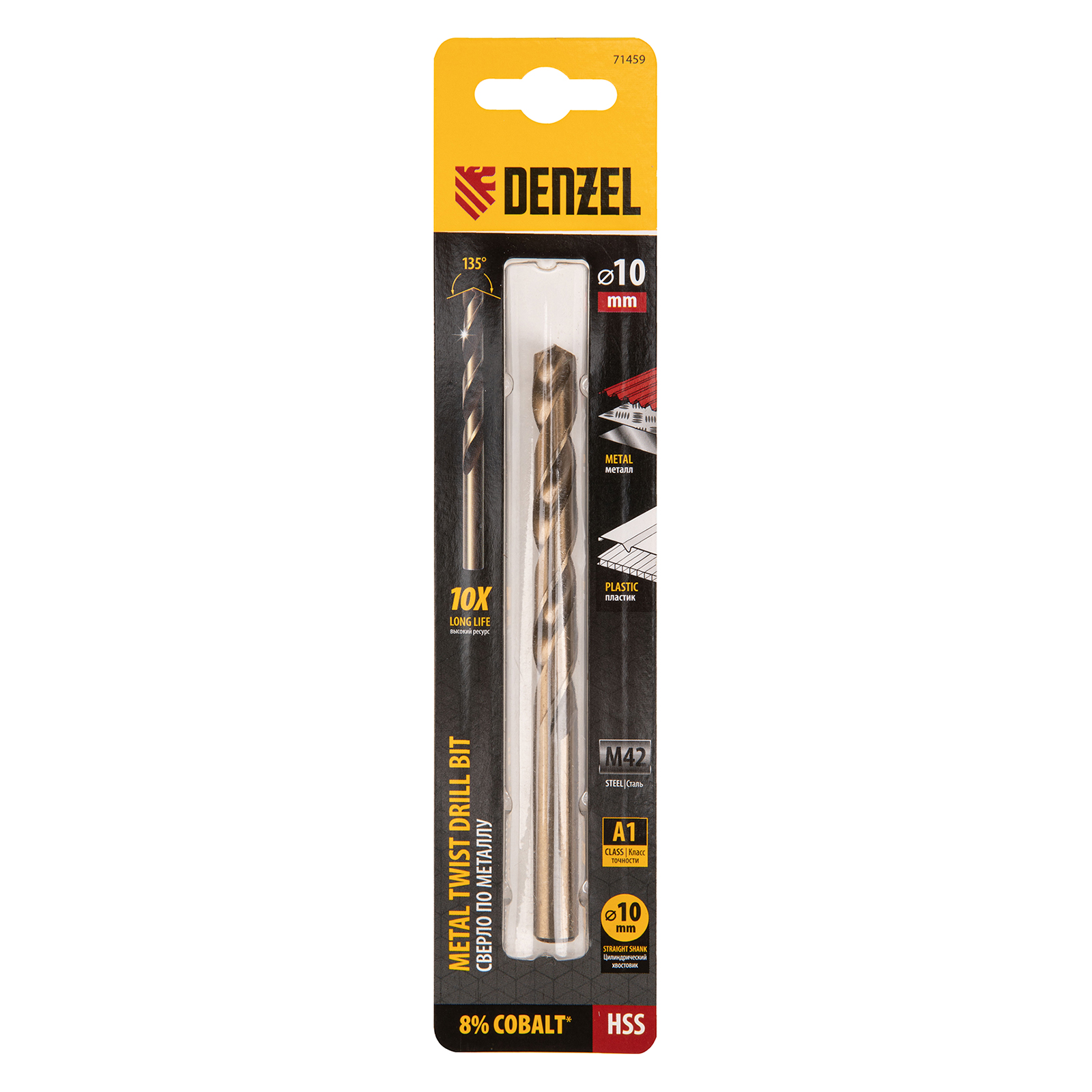 Кобальтовое сверло по металлу Denzel 71459 диаметром 10 мм, из стали HSS Co-8%, позволяет получать отверстия высокой точности в нержавеющей стали, цветных металлах, легированных и нелегированных сталях с пределом прочности до 1100 Н/мм2, а также в жестком пластике. Угол заточки 135° обеспечивает повышенную точность и чистоту сверления.