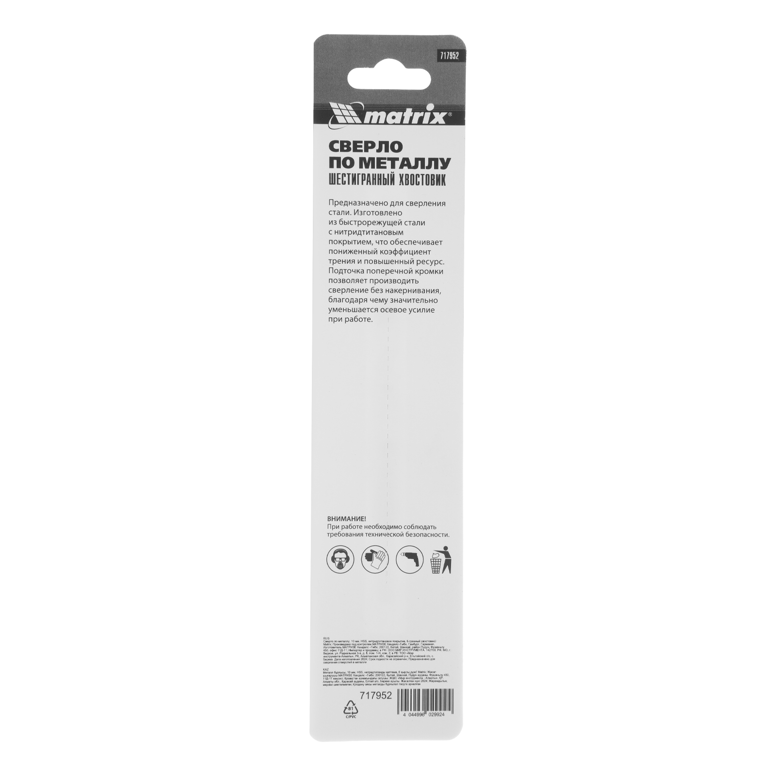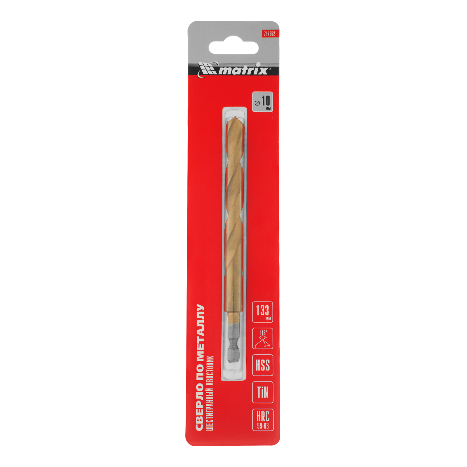 Сверло по металлу Matrix 717952 диаметром 10 мм, из стали HSS, с нитридтитановым покрытием и 6-гранным хвостовиком, предназначено для получения отверстий в черном металле, стали, чугуне и твердой бронзе. Устанавливается в патрон дрели.