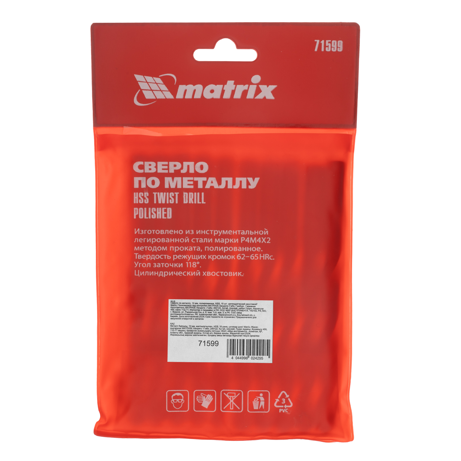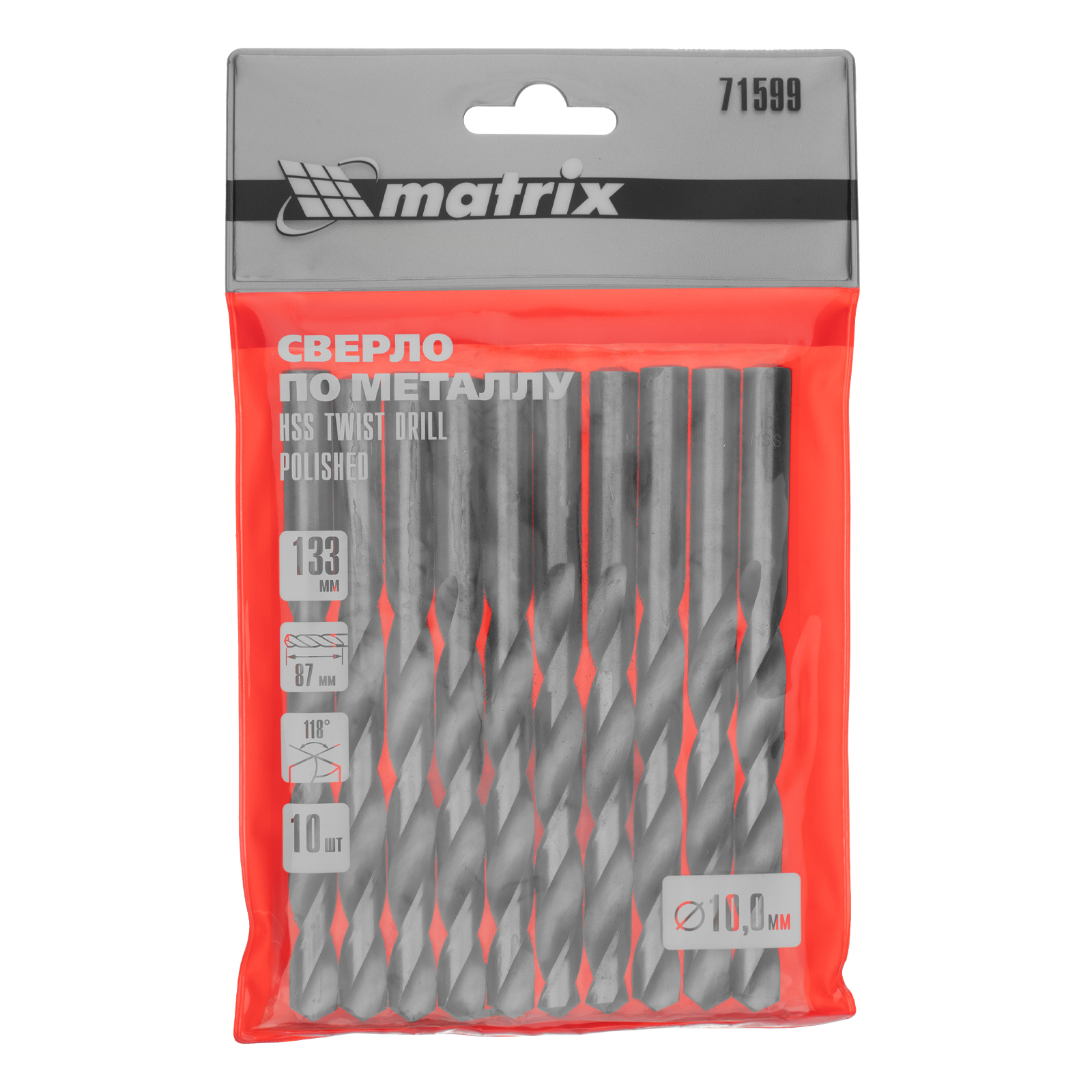 Полированное сверло по металлу Matrix 71599 из стали HSS, с цилиндрическим хвостовиком, 10 шт. в упаковке, используется для получения отверстий диаметром 10 мм. Угол заточки составляет 118 градусов, поэтому сверло оптимально для работы с черными металлами, сталью, чугуном и твердой бронзой.