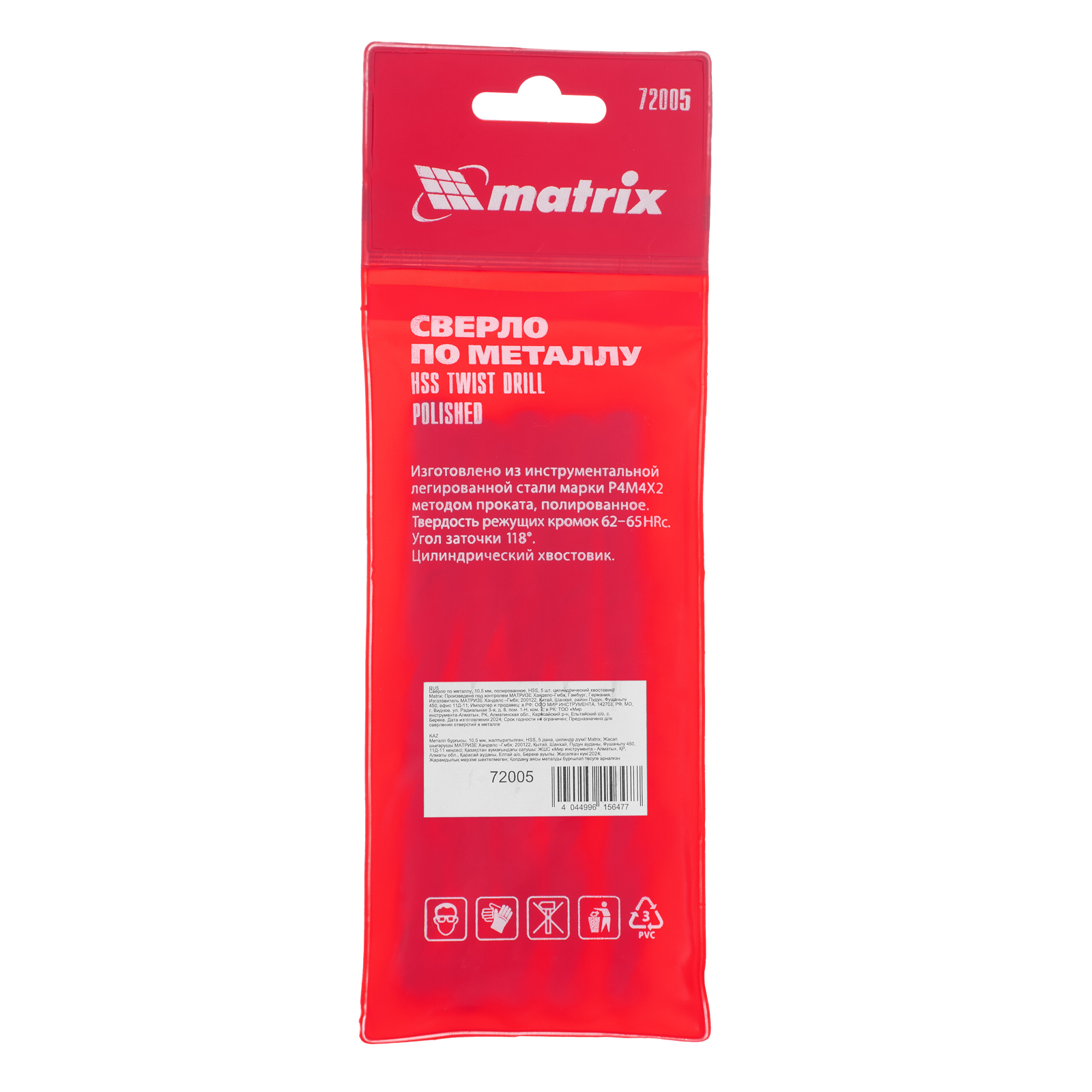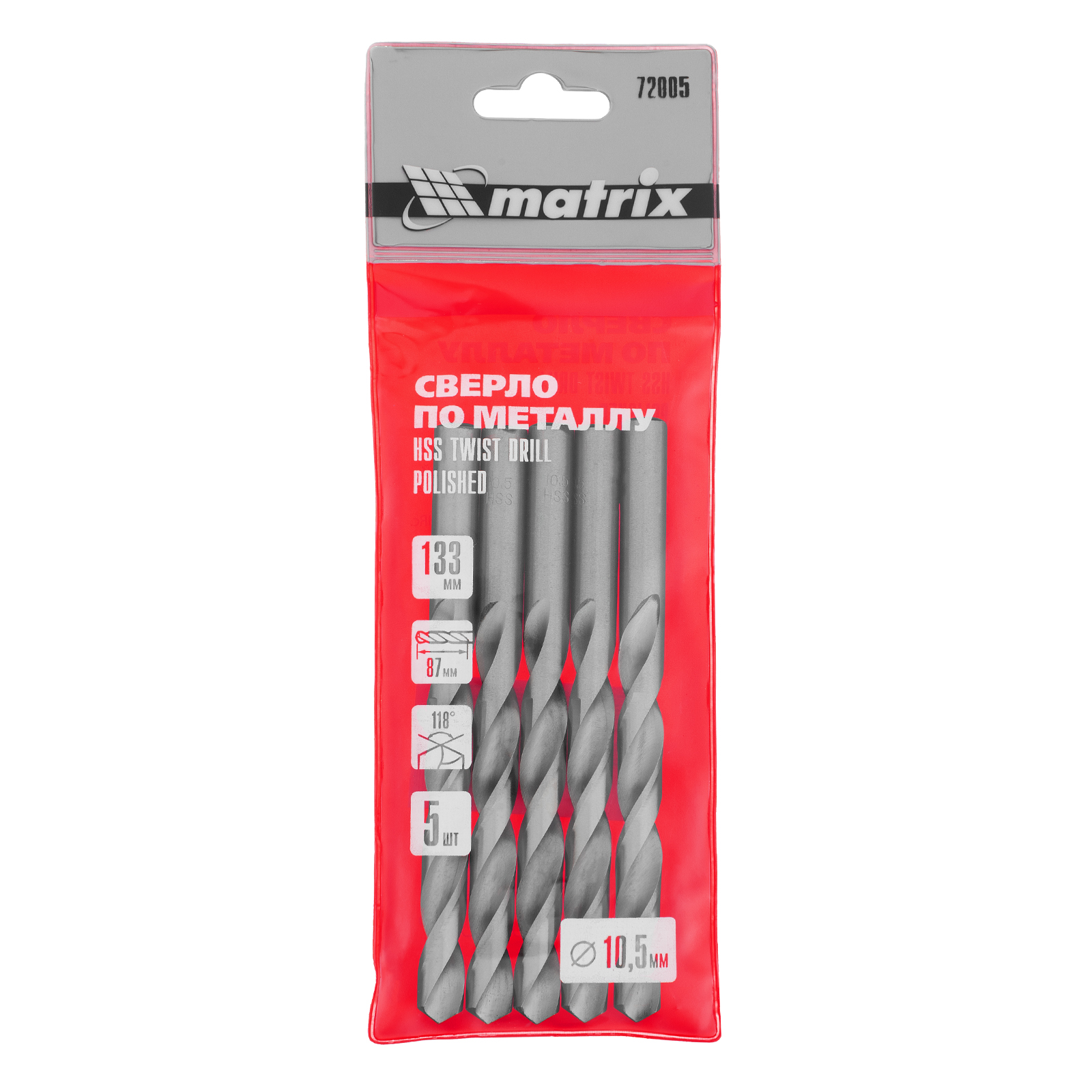 Полированное сверло по металлу Matrix 72005 из стали HSS, с цилиндрическим хвостовиком, 5 шт. в упаковке, используется для получения отверстий диаметром 10,5 мм. Угол заточки составляет 118°, поэтому сверло оптимально для работы с черными металлами, сталью, чугуном и твердой бронзой.