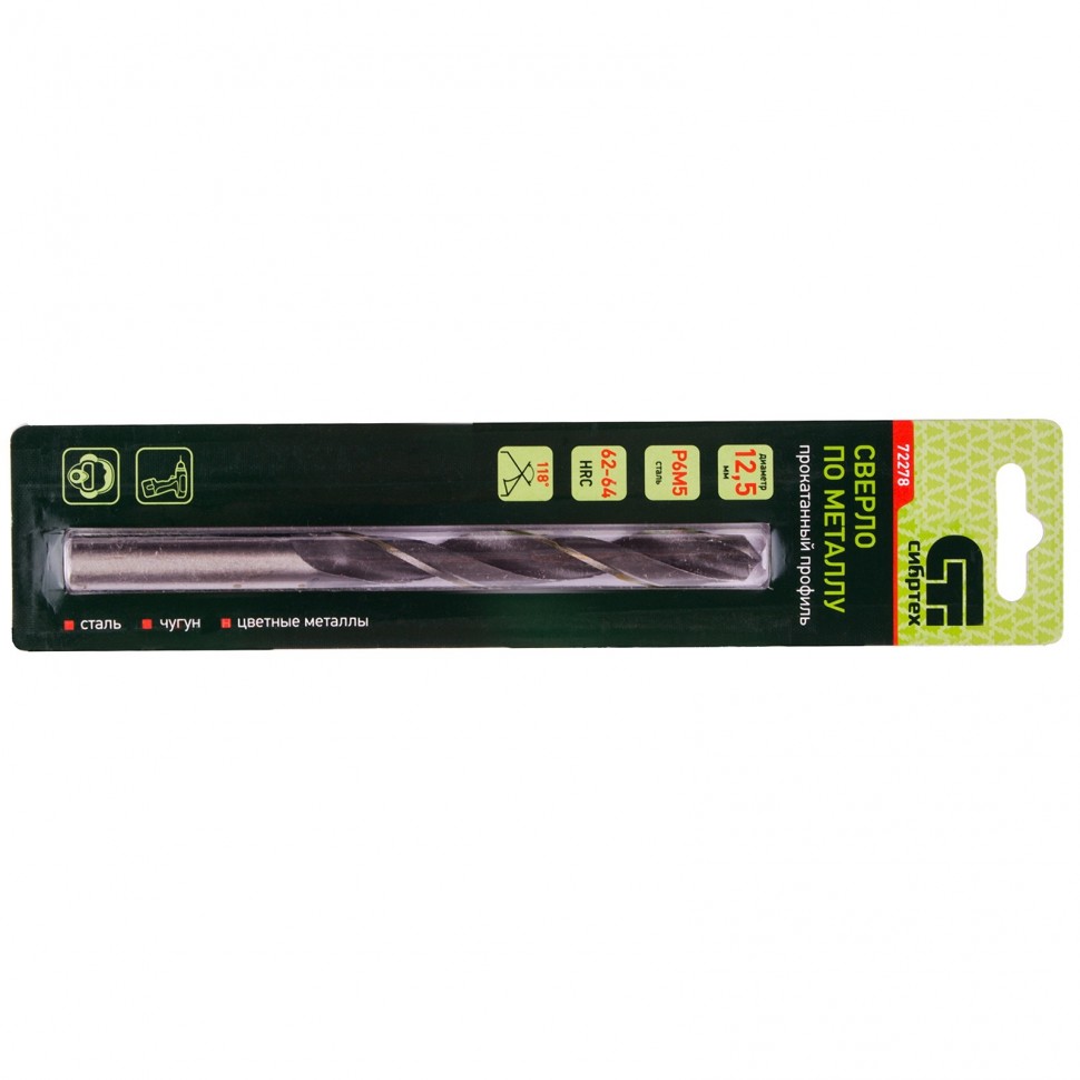 Сверло по металлу Сибртех 72278 диаметром 12,5 мм, имеет угол заточки 118°, оптимальный для получения отверстий в черных и тяжелых металлах, в том числе стали, чугуне и твердой бронзе. Отличается наиболее выгодной стоимостью по сравнению с другими моделями из стали P6M5. Используется для выполнения монтажно-сборочных работ, будет полезно в быту.