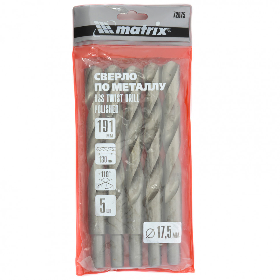 Полированное сверло по металлу Matrix 72075 из стали HSS, с цилиндрическим хвостовиком, 5 шт. в упаковке, используется для получения отверстий диаметром 17,5 мм. Угол заточки составляет 118°, поэтому сверло оптимально для работы с черными металлами, сталью, чугуном и твердой бронзой.