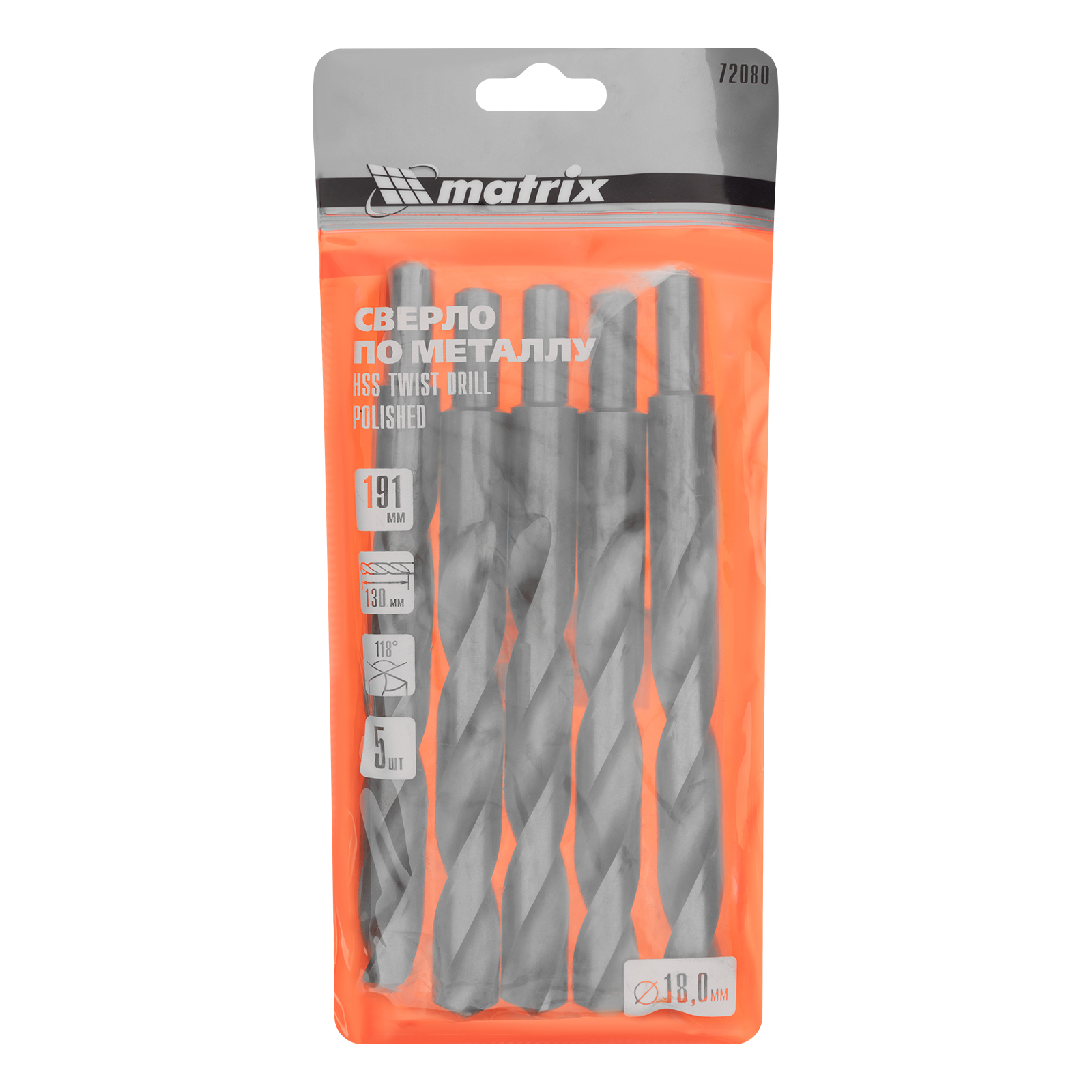 Полированное сверло по металлу Matrix 72080 из стали HSS, с цилиндрическим хвостовиком, 5 шт. в упаковке, используется для получения отверстий диаметром 18 мм. Угол заточки составляет 118°, поэтому сверло оптимально для работы с черными металлами, сталью, чугуном и твердой бронзой.