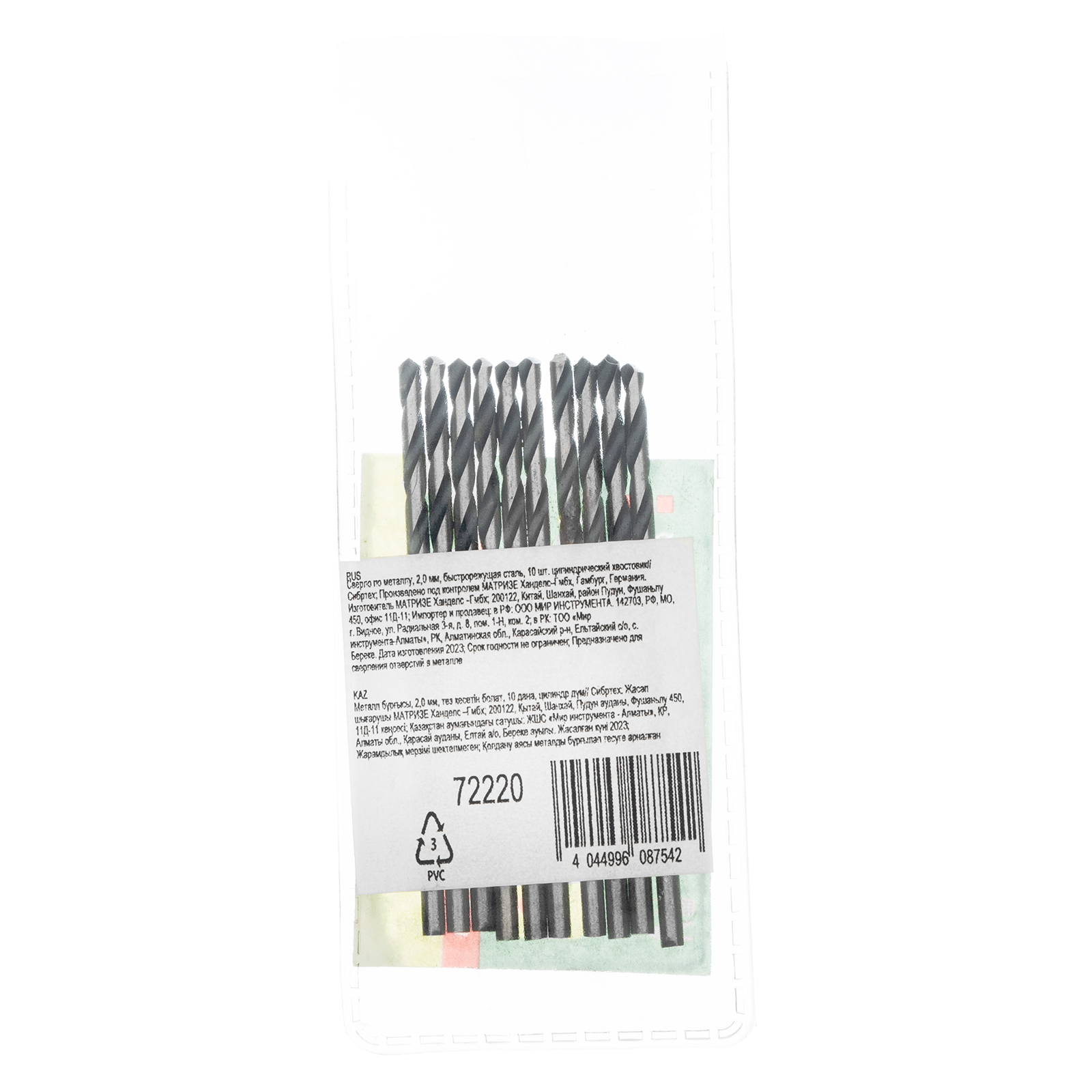 Сверло по металлу Сибртех 72220 из быстрорежущей стали, с цилиндрическим хвостовиком, 10 шт. в упаковке, имеет угол заточки 118° и используется для получения отверстий диаметром 2,0 мм в цветных и тяжелых металлах. Инструмент применяется в профессиональных и бытовых целях.