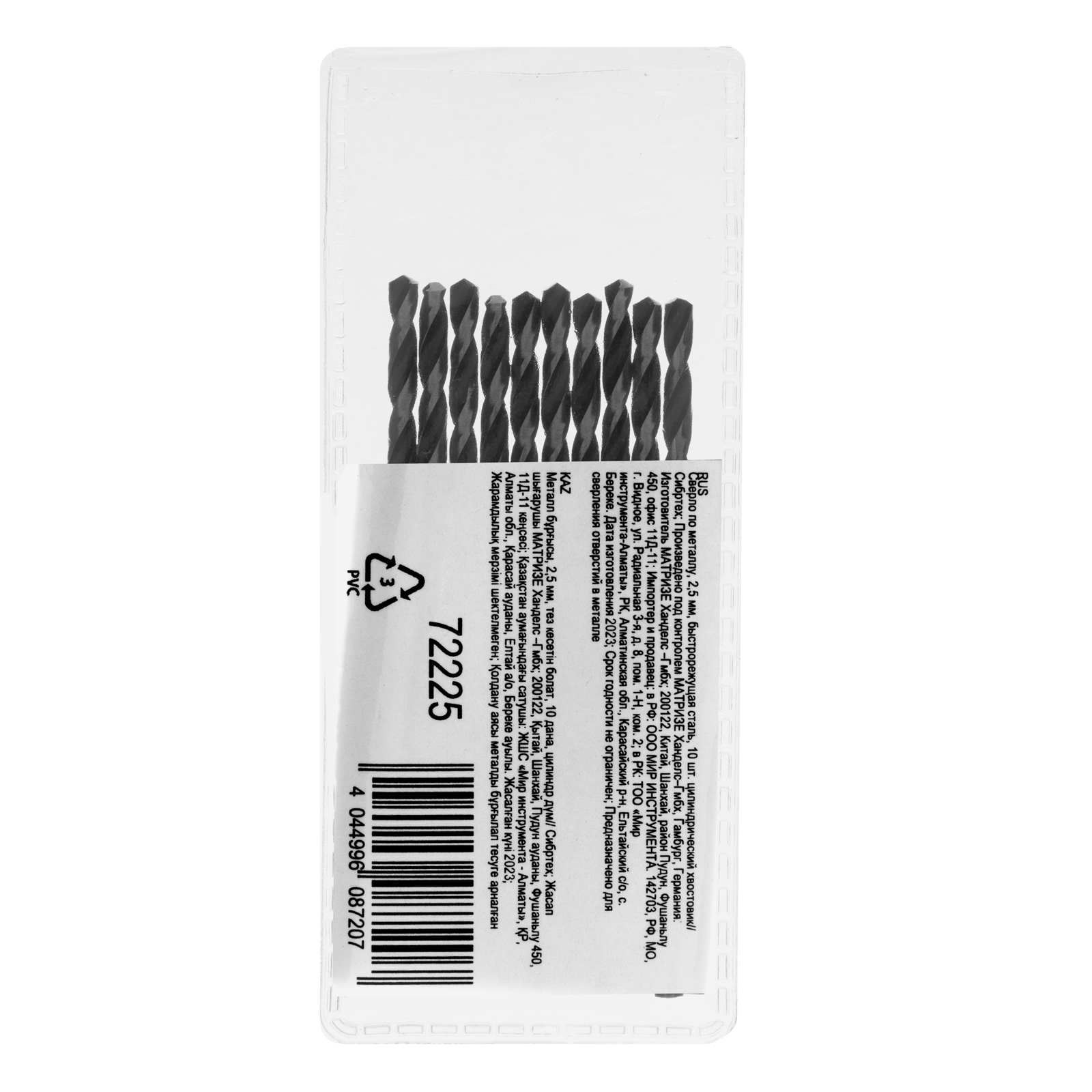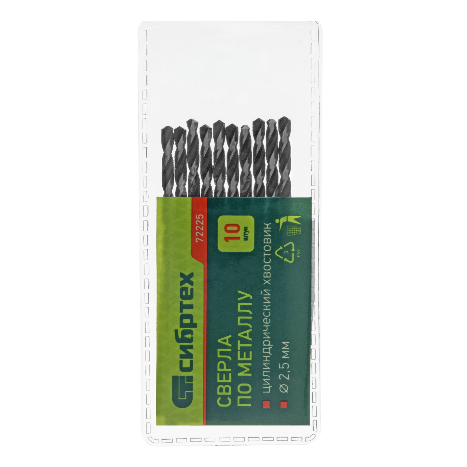 Сверло по металлу Сибртех 72225 из быстрорежущей стали, с цилиндрическим хвостовиком, 10 шт. в упаковке, имеет угол заточки 118° и используется для получения отверстий диаметром 2,5 мм в цветных и тяжелых металлах. Инструмент применяется в профессиональных и бытовых целях.