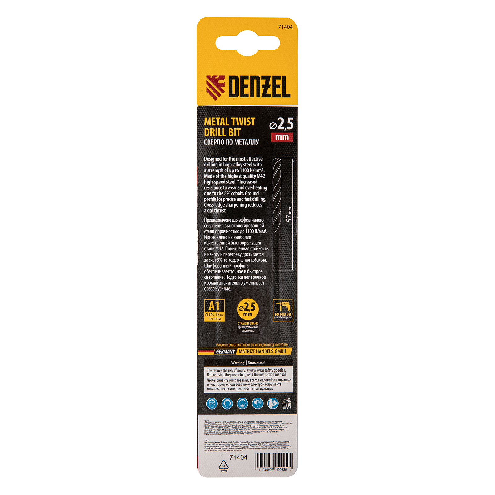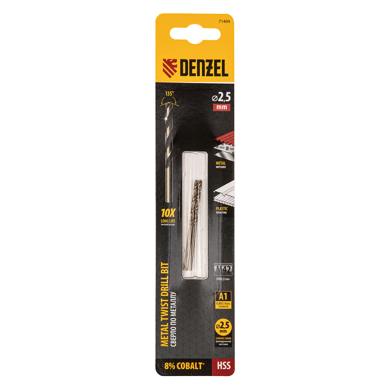 Кобальтовое сверло по металлу Denzel 71404 диаметром 2,5 мм, из стали HSS Co-8%, 2 шт. в упаковке, позволяет получать отверстия высокой точности в нержавеющей стали, цветных металлах, легированных и нелегированных сталях с пределом прочности до 1100 Н/мм2, а также в жестком пластике. Угол заточки 135° обеспечивает повышенную точность и чистоту сверления.