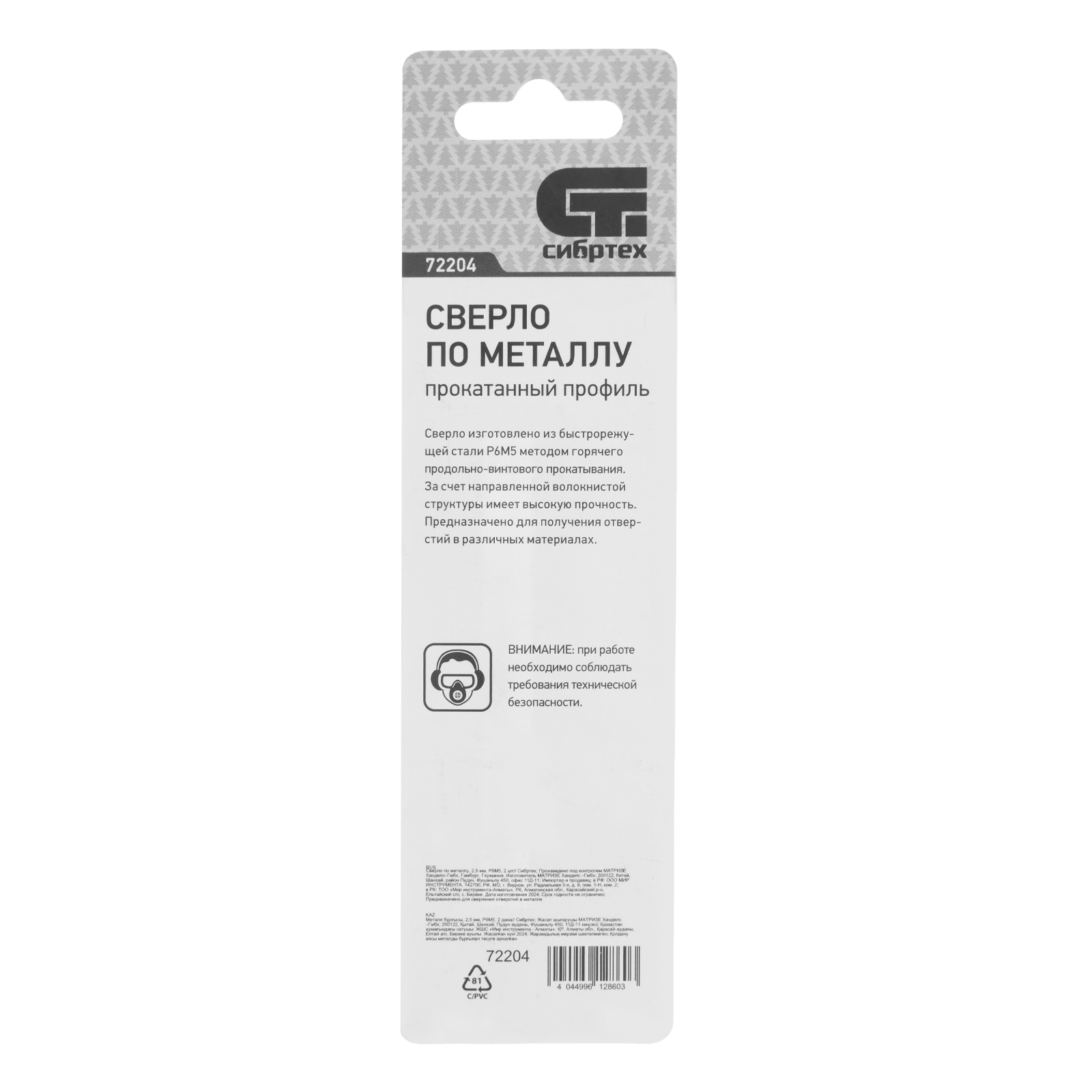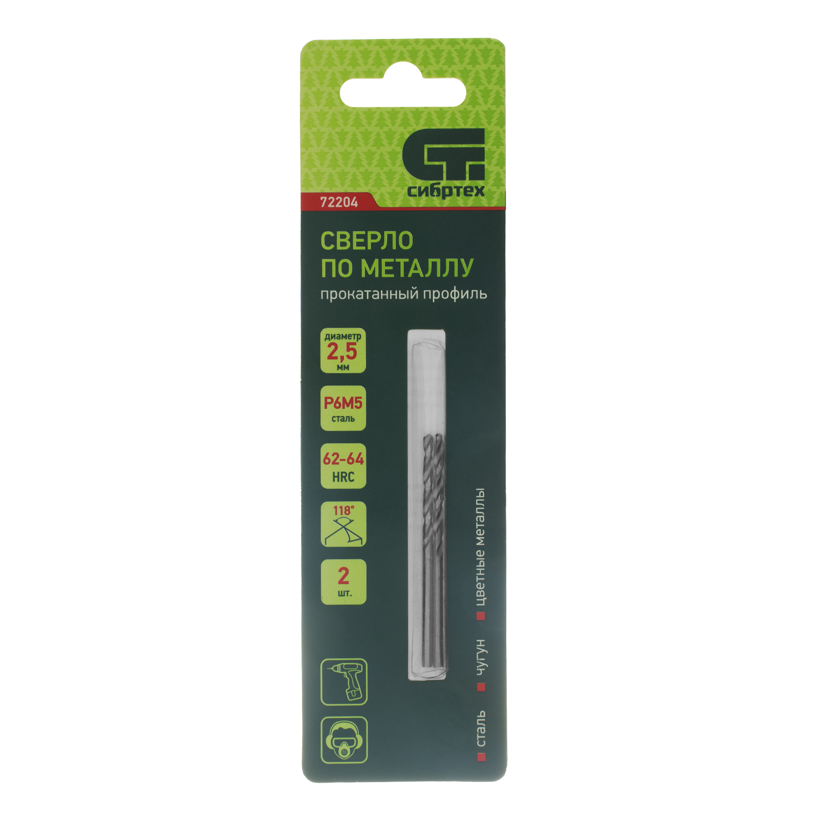 Сверло по металлу Сибртех 72204 диаметром 2,5 мм, 2 шт. в упаковке, имеет угол заточки 118°, оптимальный для получения отверстий в черных и тяжелых металлах, в том числе стали, чугуне и твердой бронзе. Отличается наиболее выгодной стоимостью по сравнению с другими моделями из стали P6M5. Используется для выполнения монтажно-сборочных работ, будет полезно в быту.