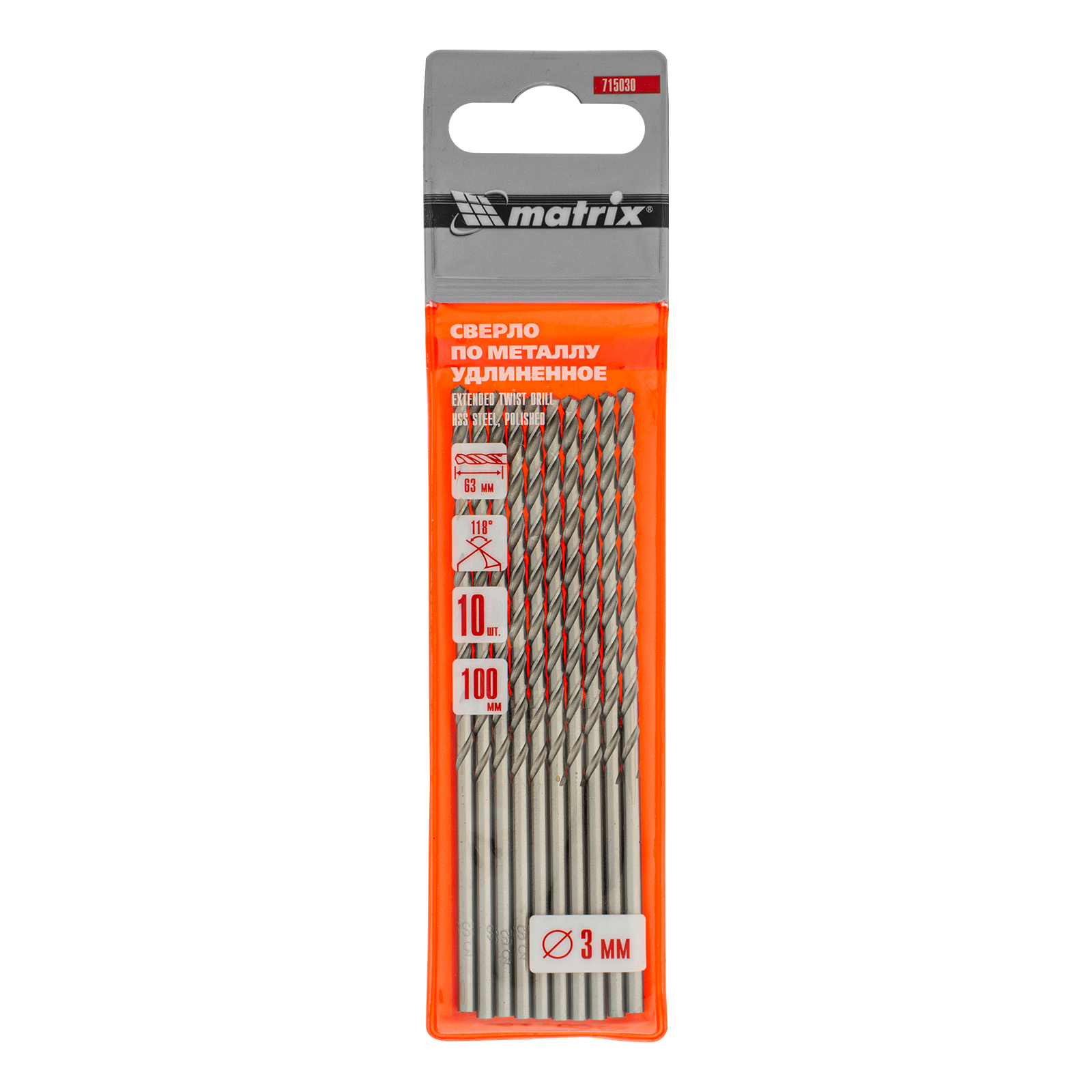 Полированное удлиненное сверло по металлу Matrix 715030 размером 3,0 х 100 мм, из стали HSS, с цилиндрическим хвостовиком, 10 шт. в упаковке, благодаря удлиненному профилю подходит для глубокого сверления. Угол заточки сверл составляет 118° и является оптимальным для работы с черными металлами, сталью, чугуном и твердой бронзой.