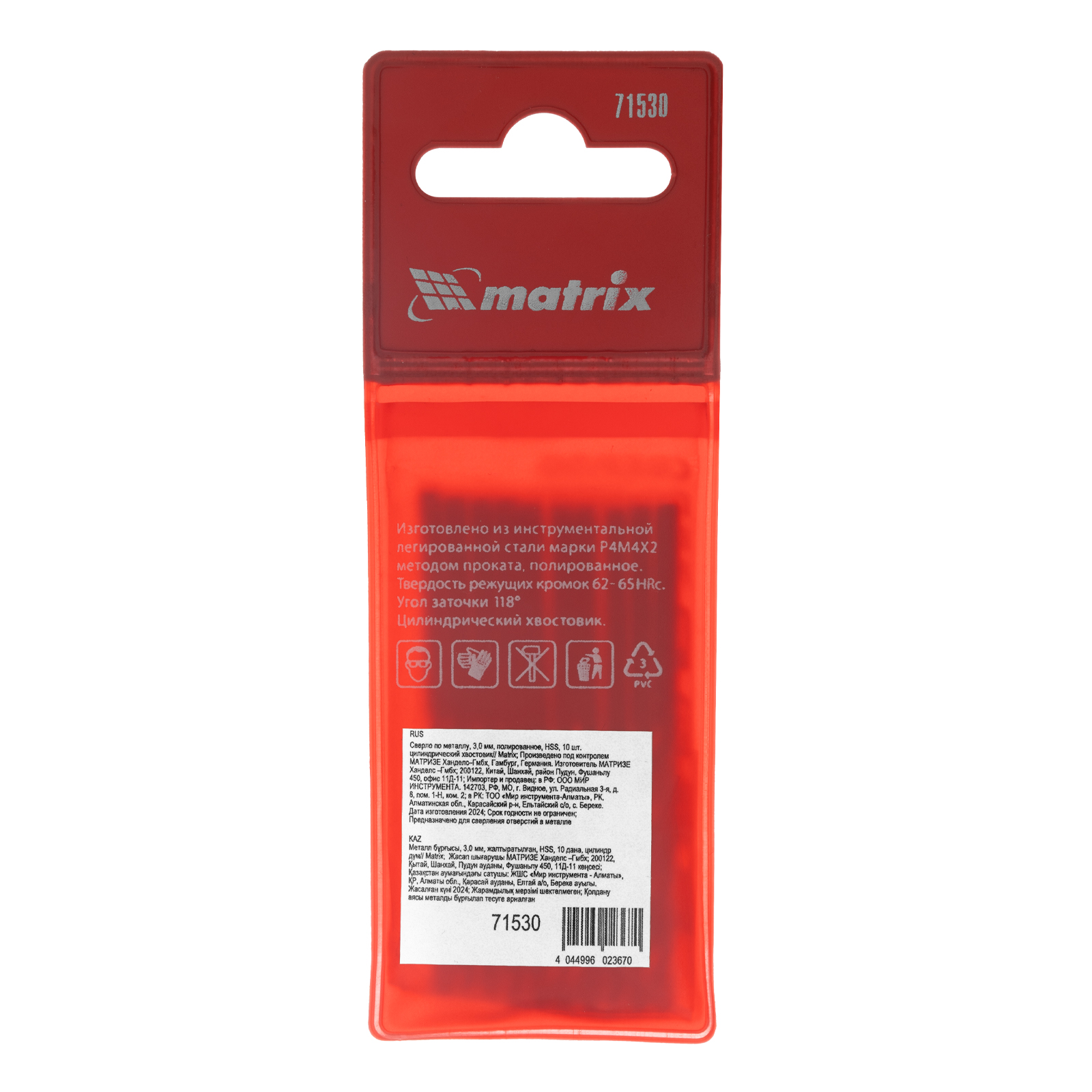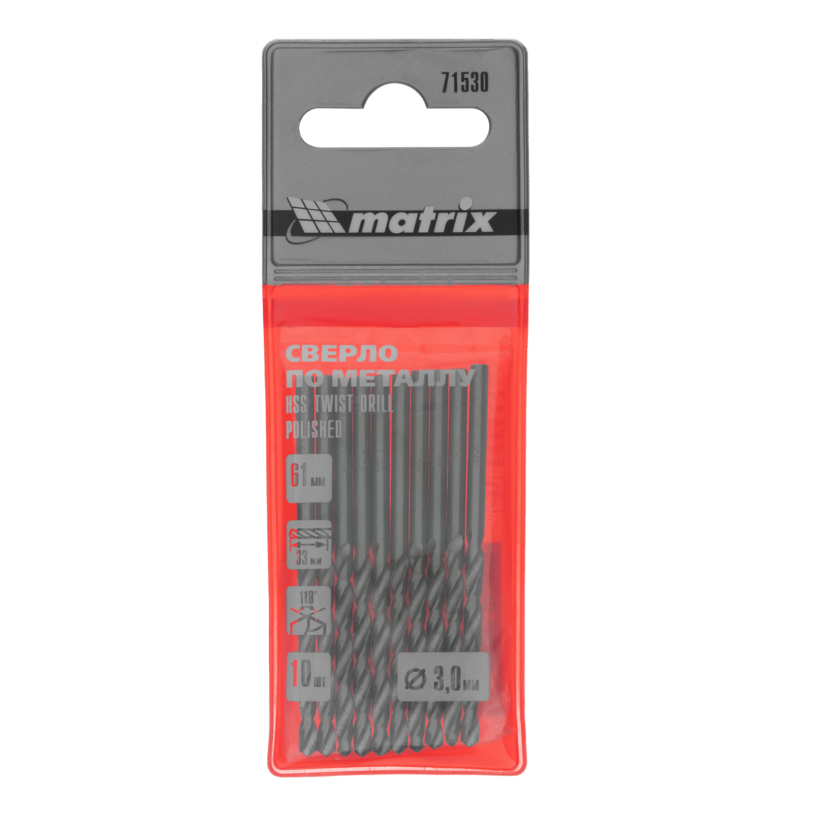 Полированное сверло по металлу Matrix 71530 из стали HSS, с цилиндрическим хвостовиком, 10 шт. в упаковке, используется для получения отверстий диаметром 3,0 мм. Угол заточки составляет 118 градусов, поэтому сверло оптимально для работы с черными металлами, сталью, чугуном и твердой бронзой.
