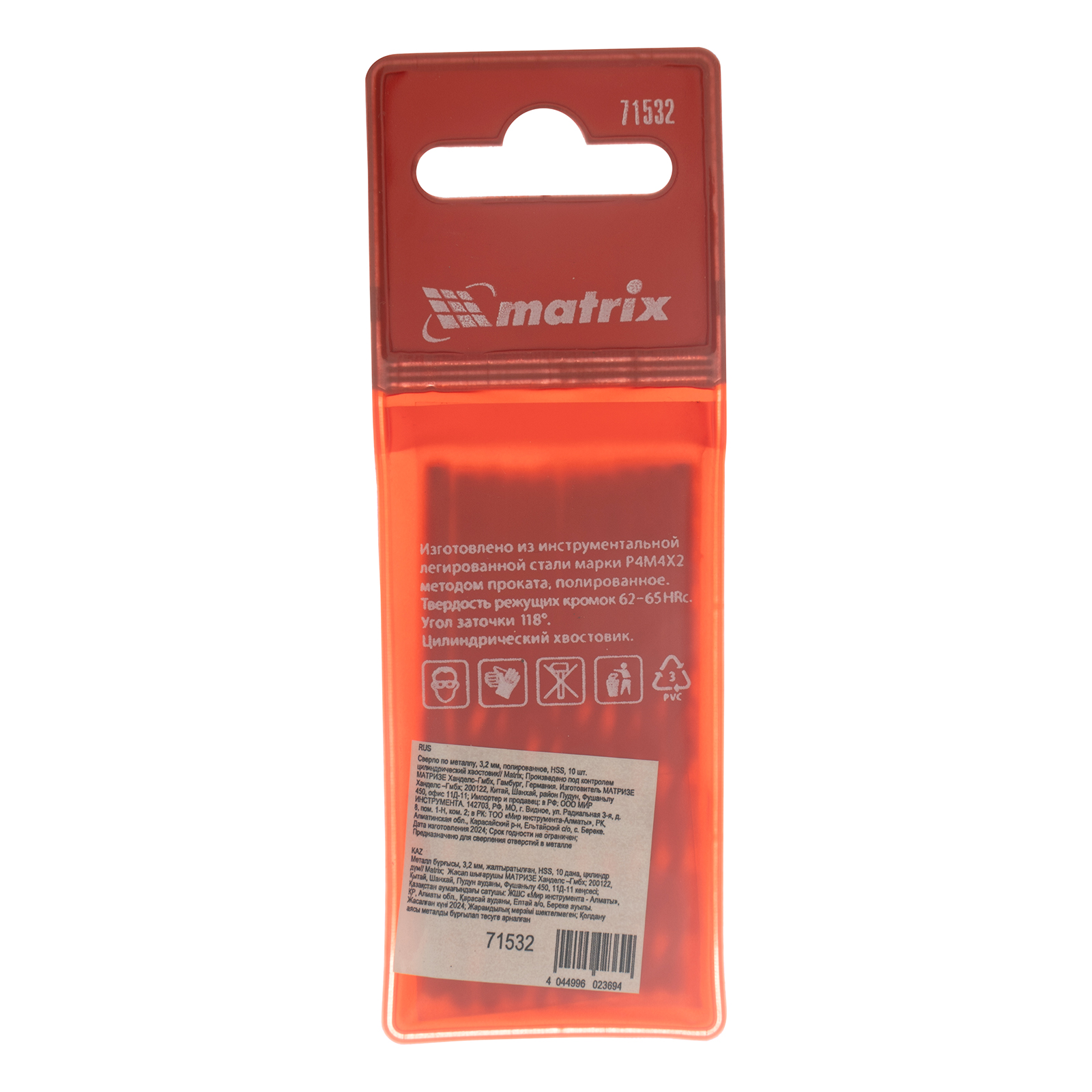 Полированное сверло по металлу Matrix 71532 из стали HSS, с цилиндрическим хвостовиком, 10 шт. в упаковке, используется для получения отверстий диаметром 3,2 мм. Угол заточки составляет 118°, поэтому сверло оптимально для работы с черными металлами, сталью, чугуном и твердой бронзой.