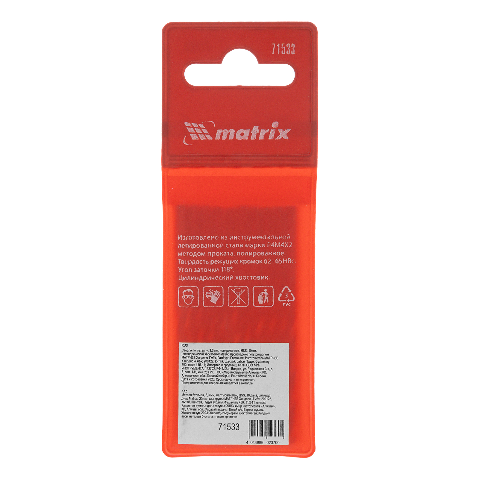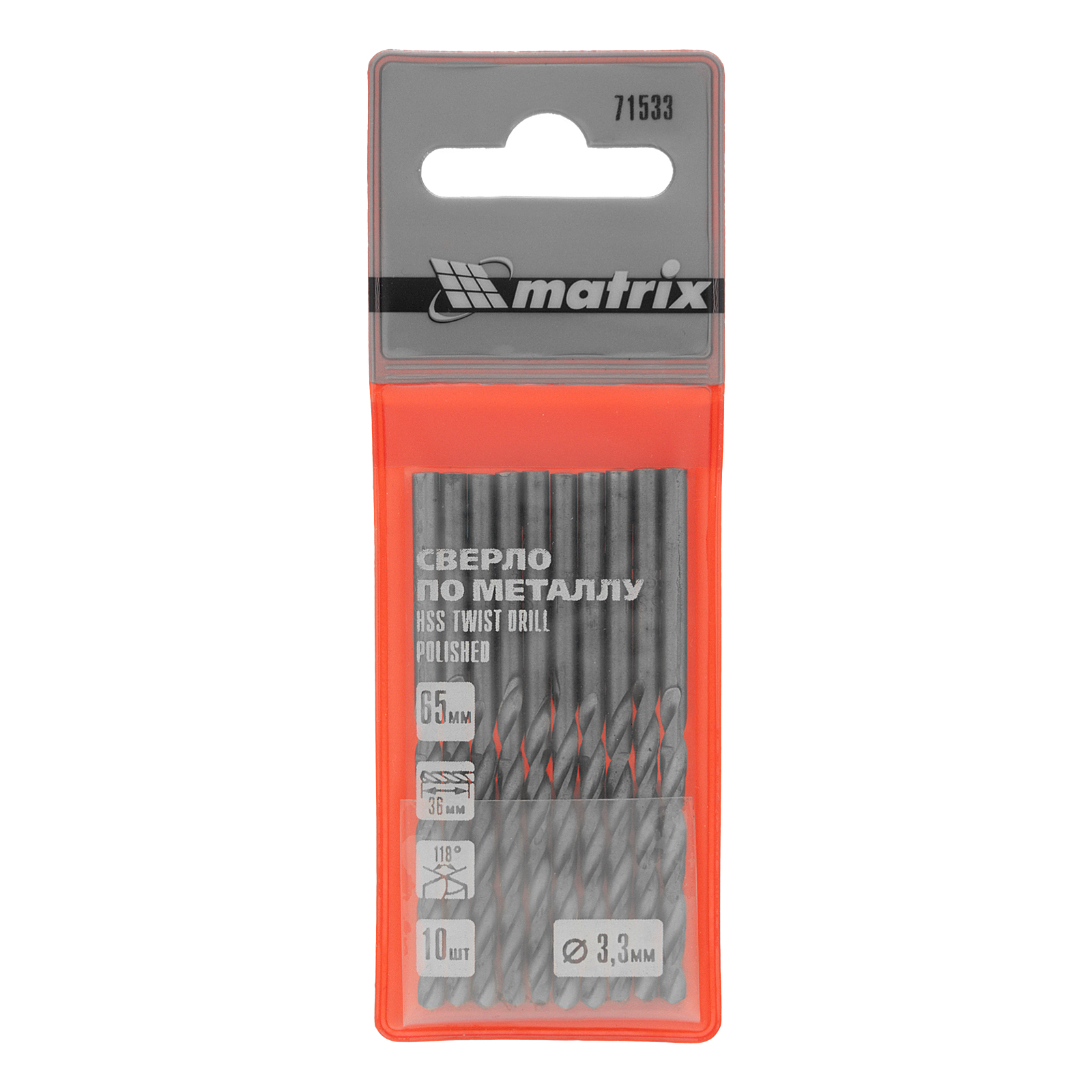 Полированное сверло по металлу Matrix 71533 из стали HSS, с цилиндрическим хвостовиком, 10 шт. в упаковке, используется для получения отверстий диаметром 3,3 мм. Угол заточки составляет 118°, поэтому сверло оптимально для работы с черными металлами, сталью, чугуном и твердой бронзой.