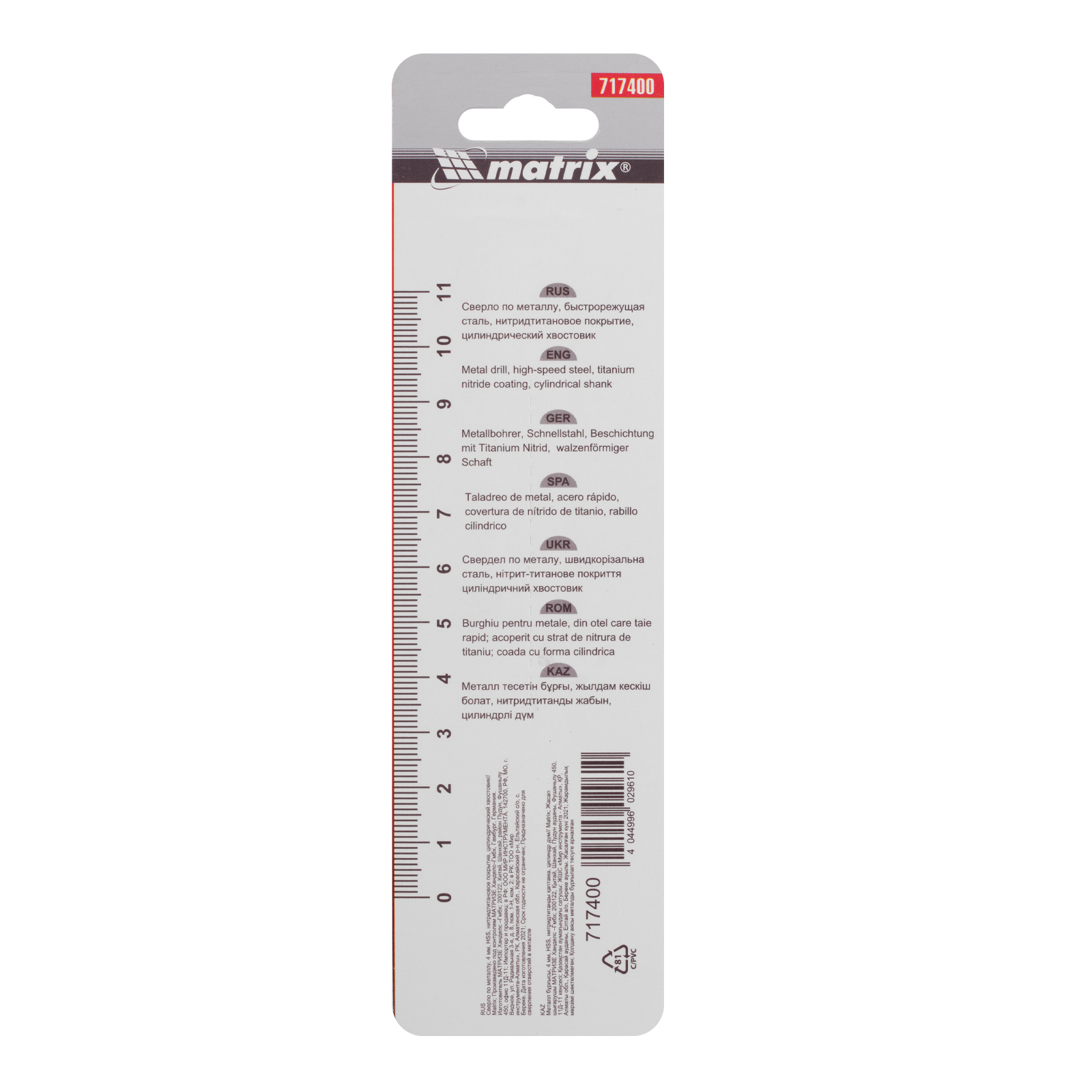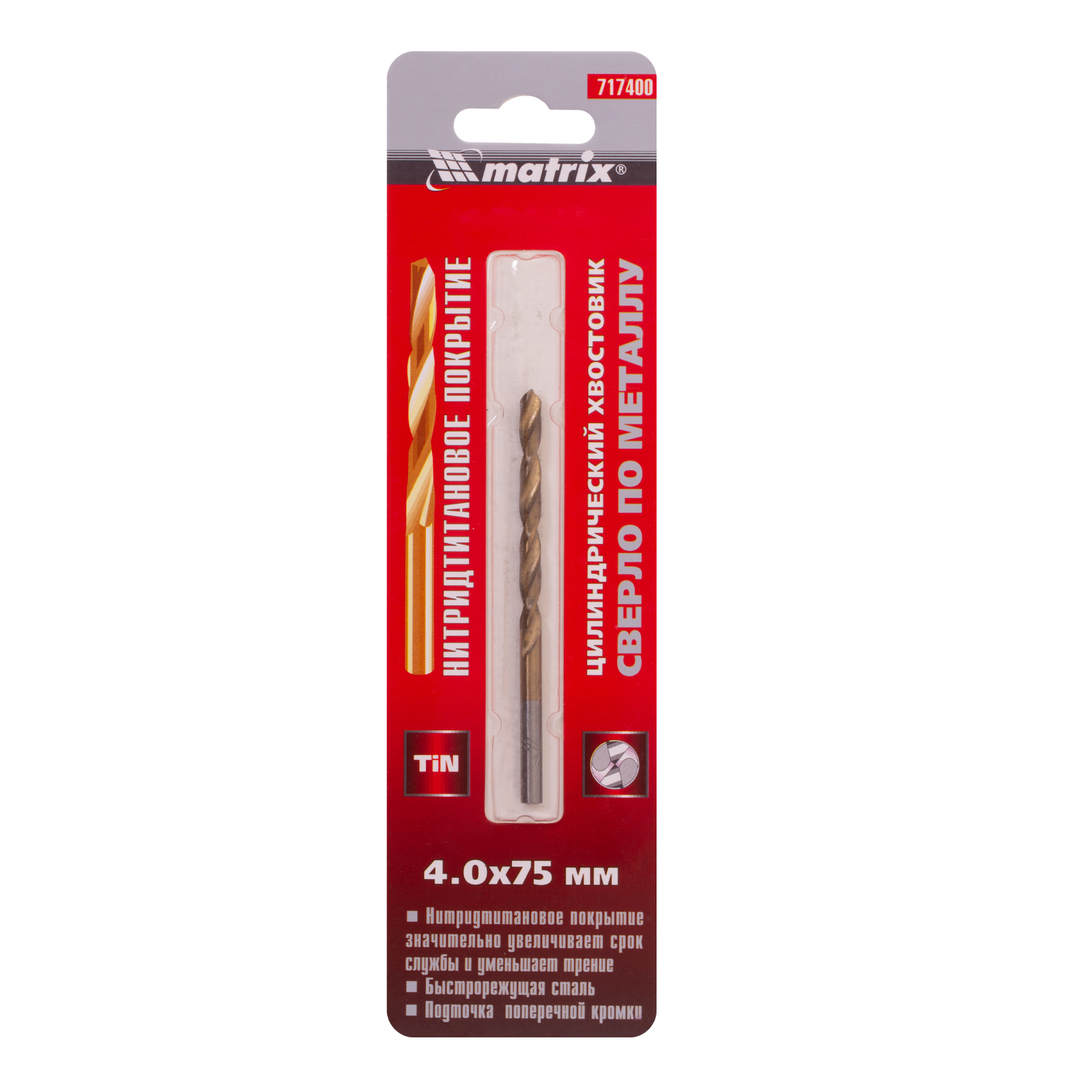 Сверло Matrix 717400 диаметром 4 мм, из стали HSS, с нитридтитановым покрытием и цилиндрическим хвостовиком, предназначено для получения отверстий в металле. Угол заточки 118° оптимален для работы с черными металлами, сталью, чугуном и твердой бронзой. Сверло выдерживает интенсивные нагрузки и подходит для профессионального использования.